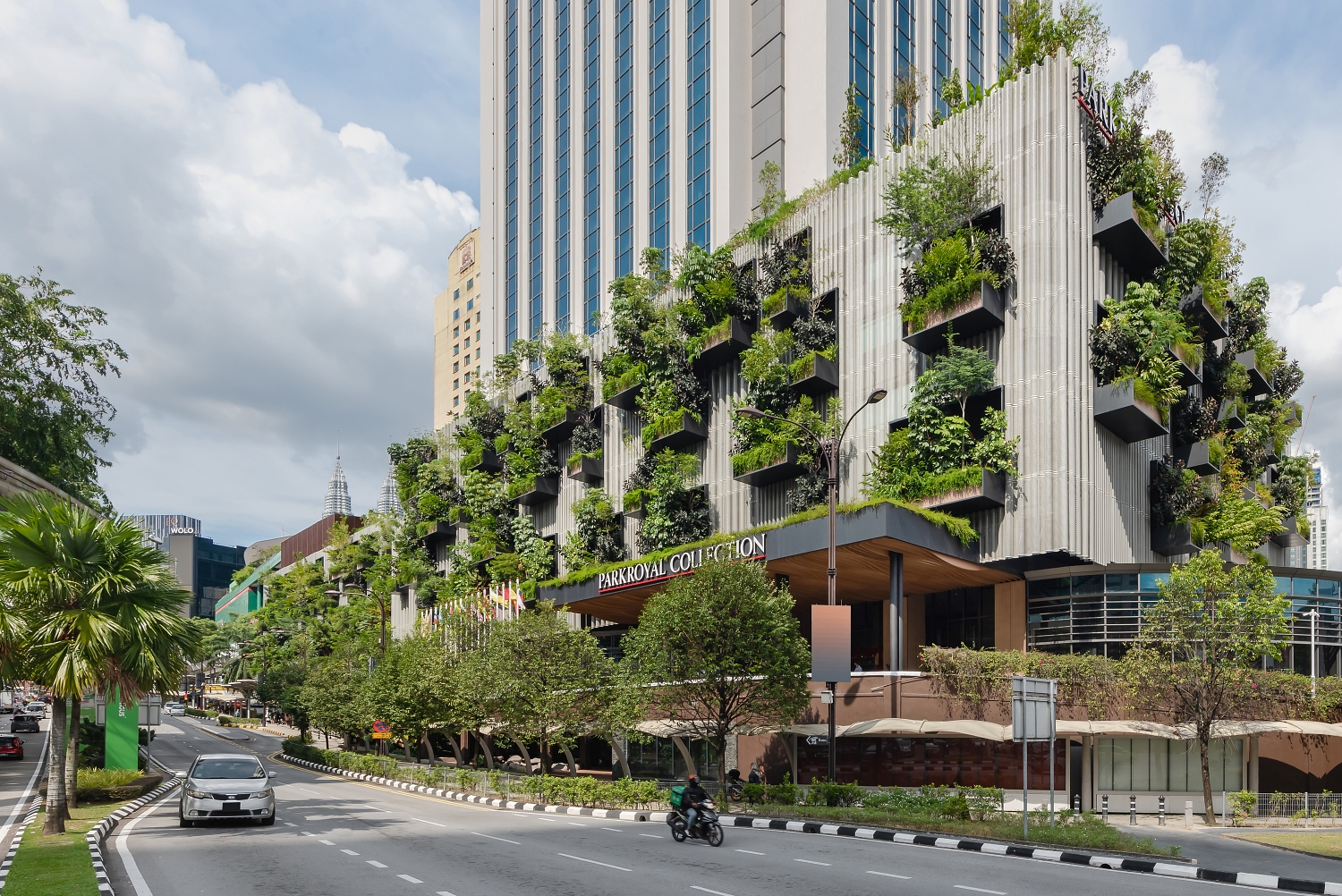 PARKROYAL COLLECTION Kuala Lumpur looks at alternative ways a city can be “greened” by breathing new life into older existing buildings. It is our client’s wish to offer a more diverse selection that enables the conversion of 29 units of old office suites into hotel rooms of 112 keys to complement the existing Park Royal Hotel. The design transforms the existing, enclosed concrete building in a dense city centre into a refreshing green lung. Extensive sky planters bring lush greenery directly into guestrooms and public areas – creating unique garden spaces for guests. The lush greenery is highly visible from one of the most prominent junctions of Kuala Lumpur, of Jalan Imbi and Jalan Sultan Ismail, ending vistas from surrounding streets and buildings; buffering heat and offering much-needed relief to the city.