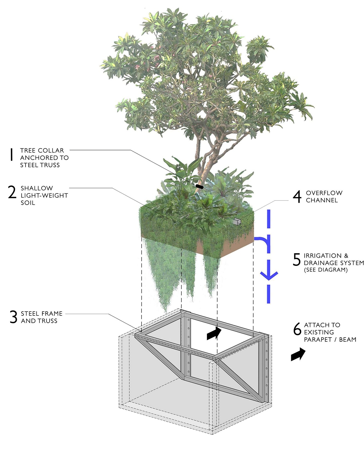 78 sky planters cantilever up to 2.6m from the existing building bring lush greenery directly into guestrooms and public areas – creating unique garden spaces for guests. The leafy foliage shade hard concrete surfaces, preventing reflected heat and the urban heat island effect. The positions of the sky planters are staggered to create different volumes suitable for shrubs and trees of various heights. A wide variety of tropical trees and shrubs are selected, moving away from mono-culture by curating a natural palette of plants. Plants mostly native to Malaysia are selected for hardiness, reduced maintenance, and increased pest and disease resistance as opposed to purely decorative species. The different foliage is also layered and attractive in a naturalistic manner.