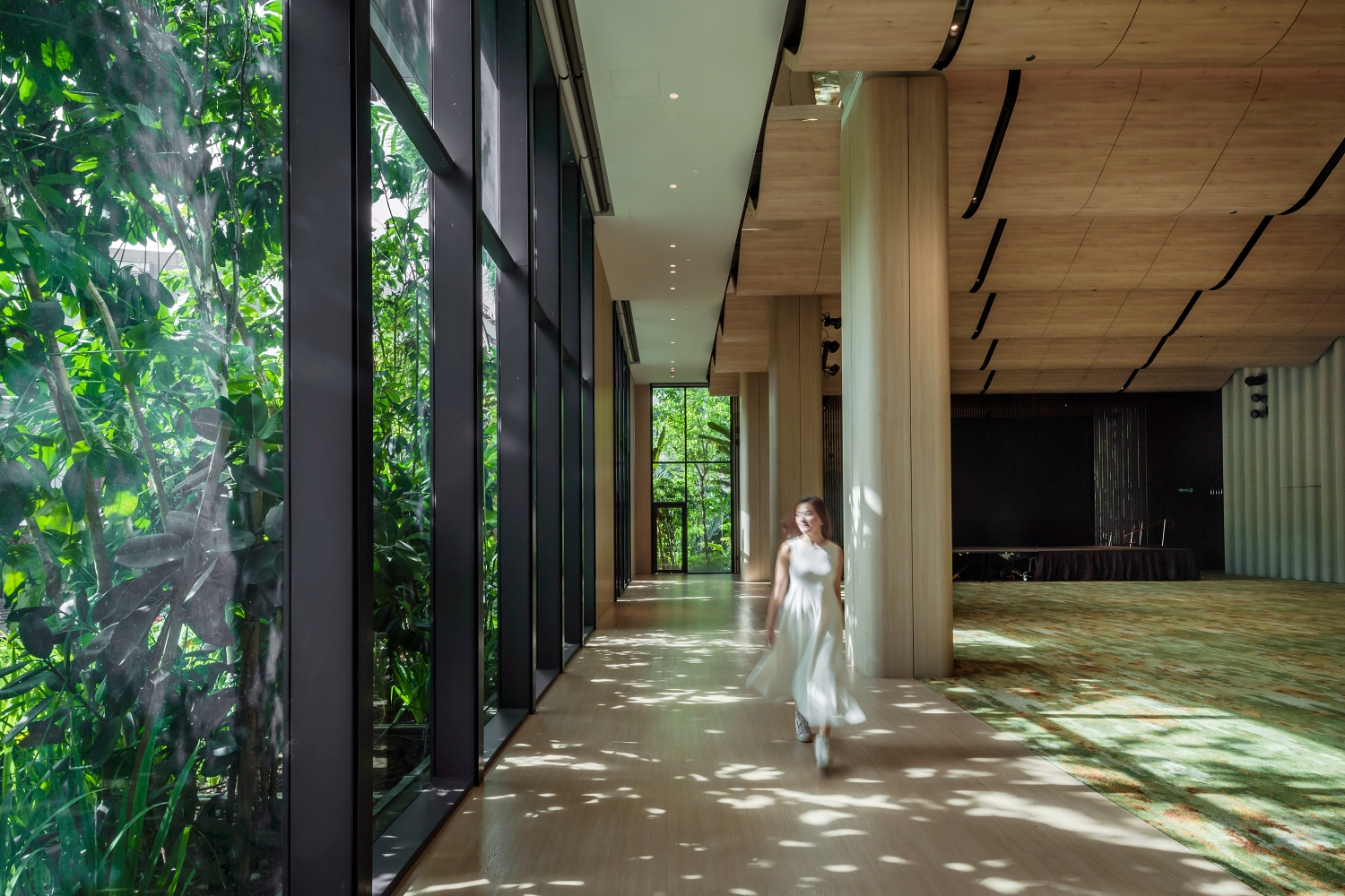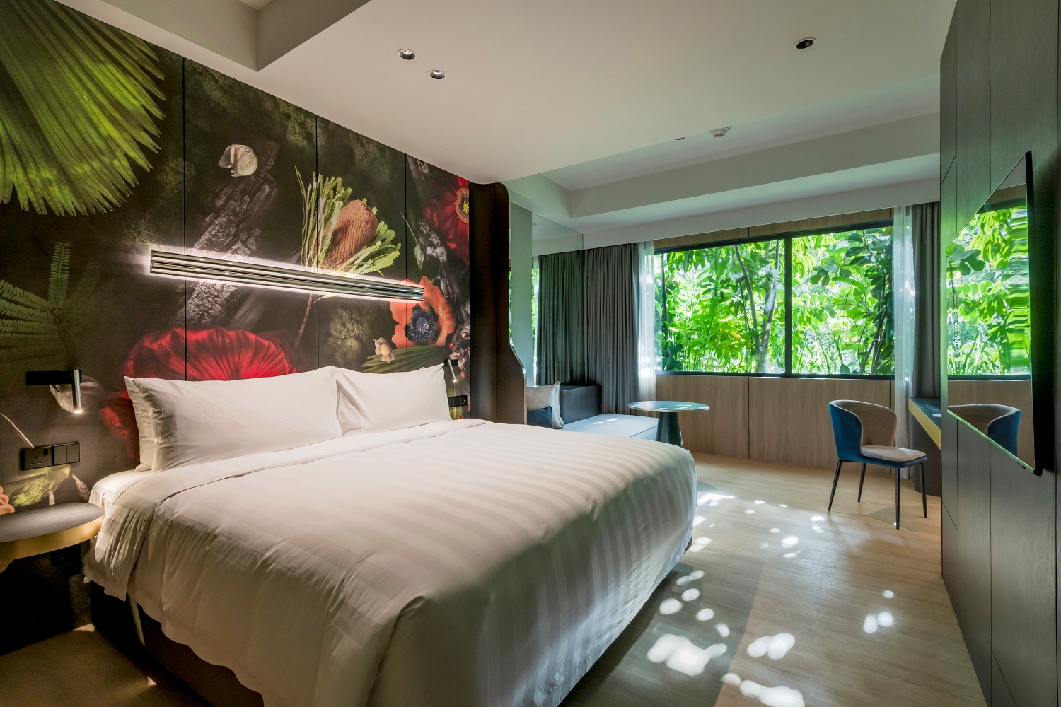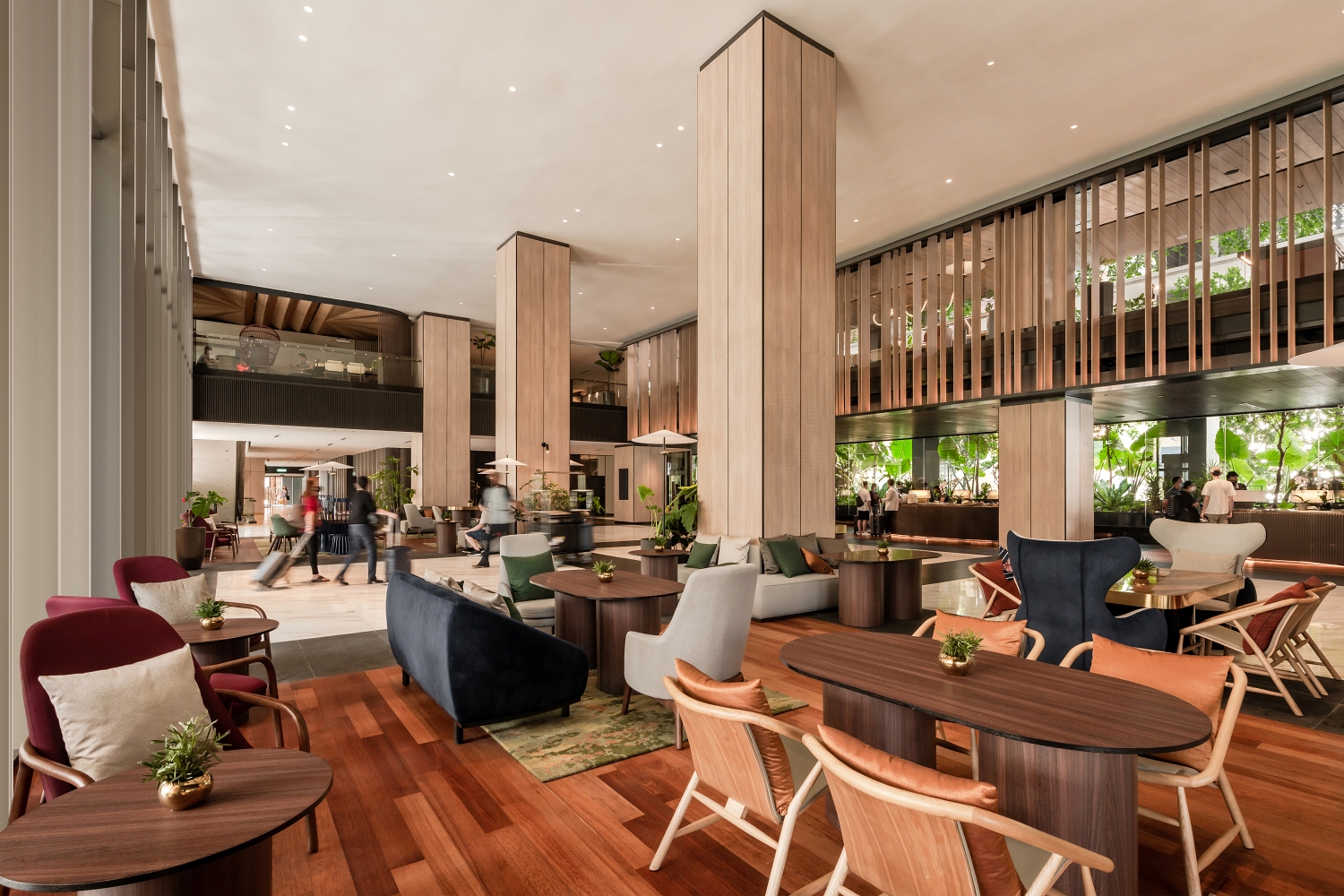 We took a holistic biophilic approach, using greenery to soften the façade and create a unique garden experience for guests that permeates the entire hotel. Guests arrive at a double-volume lobby space flanked by a lush green backdrop, overlooked by a timber-clad treehouse. Cantilevered facade planters lift greenery directly to interior spaces. The ballroom, previously fully enclosed, is now opened to abundant light and greenery creating a unique garden Ballroom experience. Guestrooms receive gardens directly to bedrooms or bathrooms. These gardens also work as an attractive foil, screening away the elevated monorail viaduct which runs alongside the hotel.