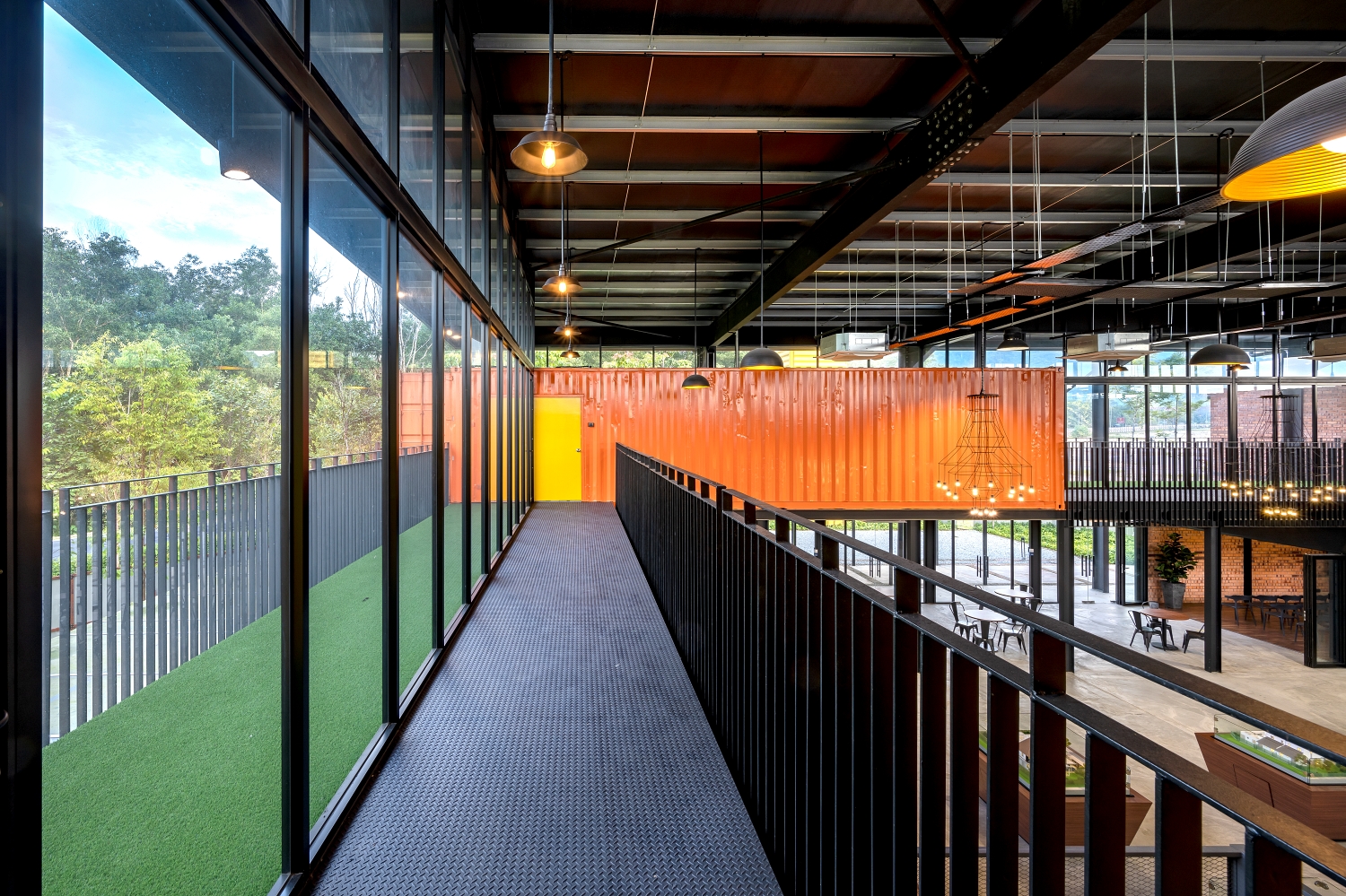 The elevated walkway that connected them was served with two functions divided with glass walls to grant visual connectivity between the indoor and outdoor spaces. It translates the internal walkway as a walking gallery, stage, and atrium audience in relation to the double volume space while the external walkway serves as a linear balcony to hold outdoor activities. The presence of an elevated walkway creates an interplay between the solid box and void in translation for building depth, rhythm, and shadows and to promote vertical and horizontal visual communications.