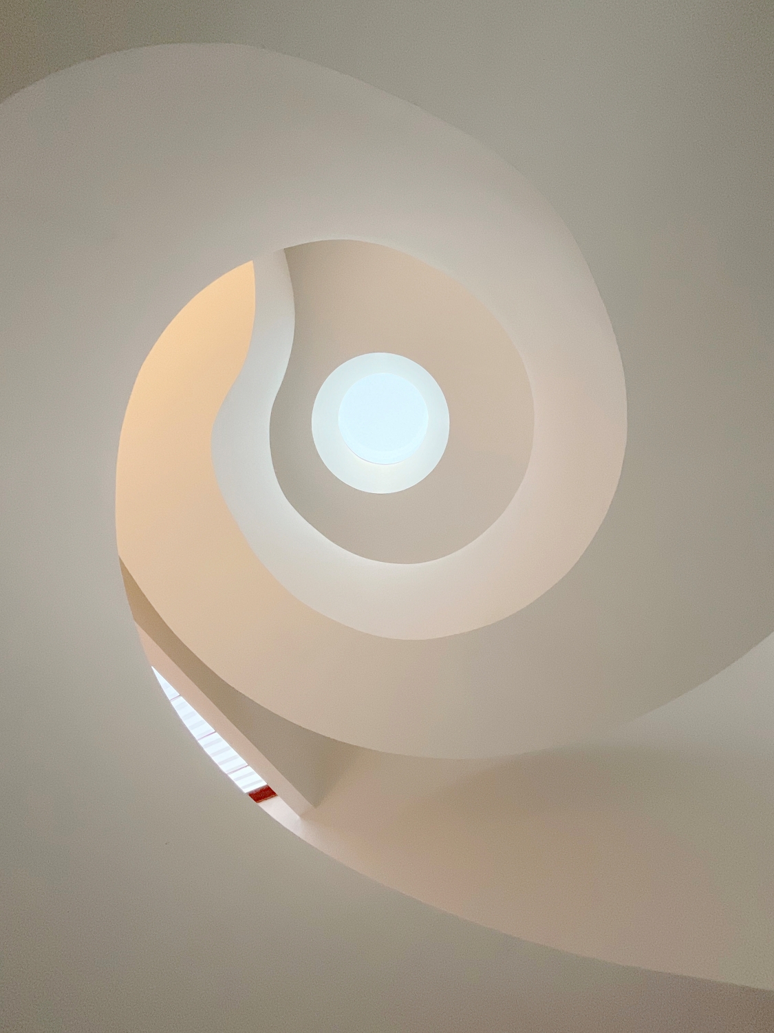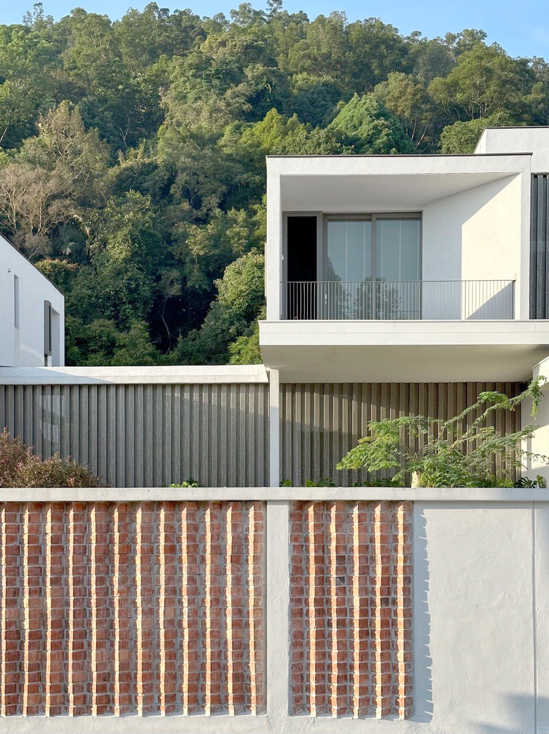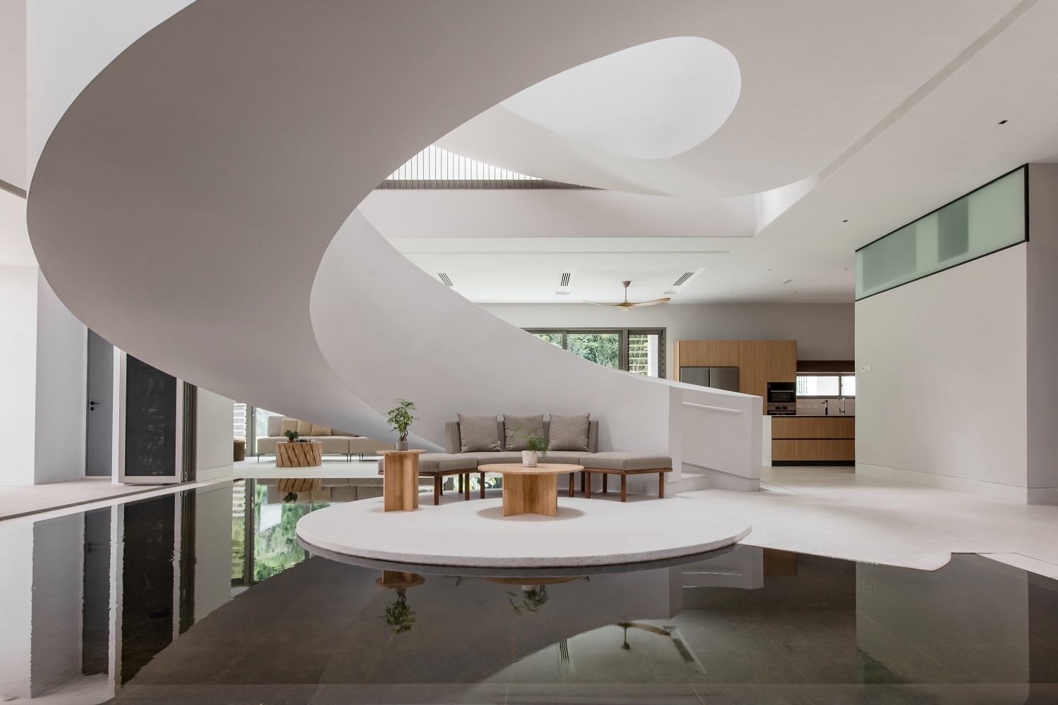 An atrium sits within which houses the family hideout space, surrounded by a prominent staircase boasting its bold sculptural quality. The towering helical flight of stairs spans three stories and vertically culminates with a circular skylight that appears precariously perched over a seemingly razor-thin surface imparting a tense reaction which gradually dissipates as the reflective pond counteracts and conveys a calming sense, further accentuated by an island of the curated landscape. Beyond its visual prowess, the atrium functions to illuminate the central space resulting in varying characteristics of light throughout the day and was designed with porous and lightweight confines via the introduction of large recessed fenestration allowing for a constant uninterrupted flow of cool breeze throughout the spaces within. In addition to the central skylight, a continuous row of skylights is also designed with a deep ceiling space in which vertical wall surfaces are utilised to reflect and diffuse natural daylight within the atrium. Fittingly, the spaces within are finished with in-situ terrazzo giving a seamless look complementing the voluminous space. Beyond that, ventilation slits and perforated aluminium screens are introduced throughout the space to address privacy concerns stemming from external thoroughfare along the front elevation.