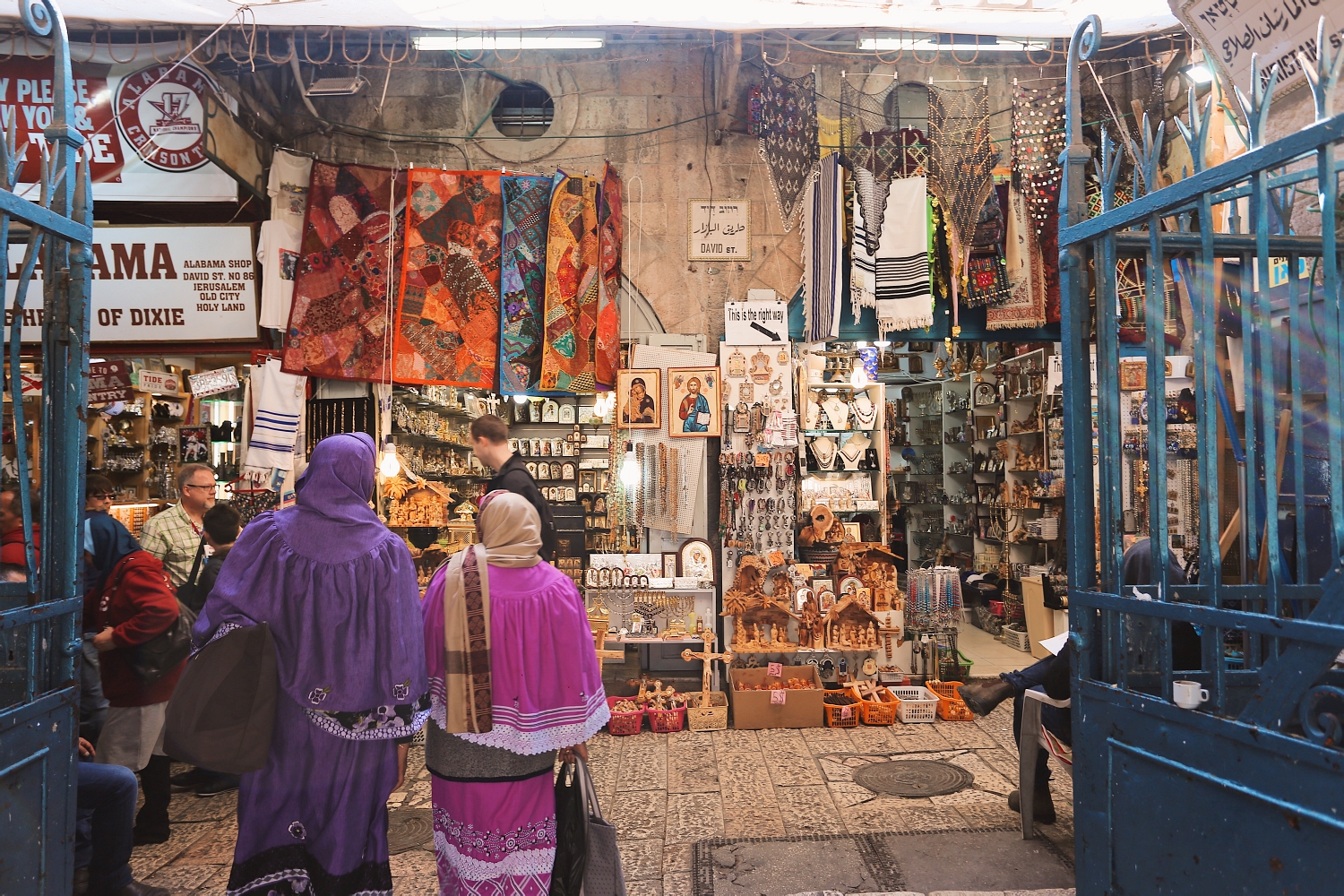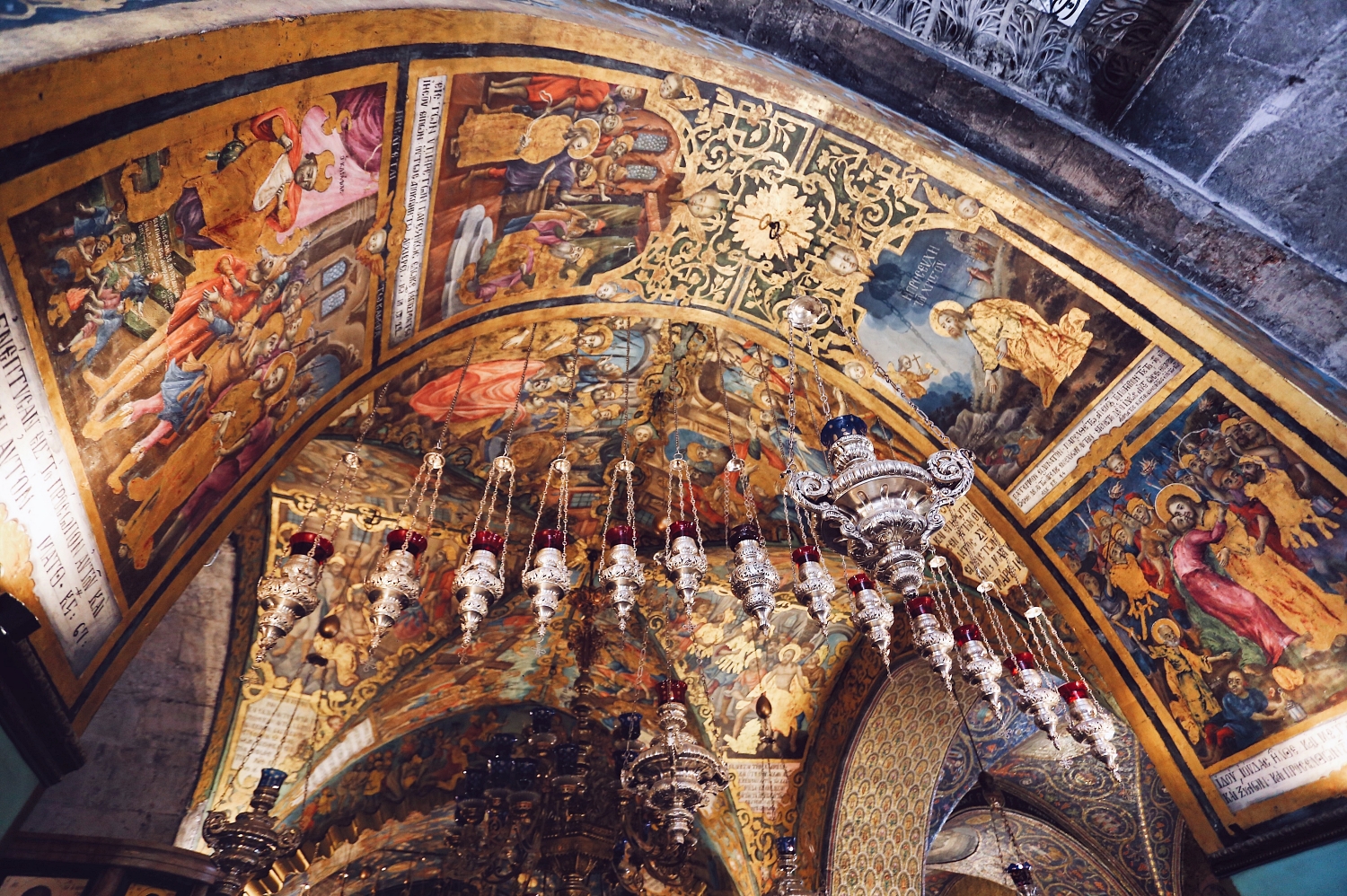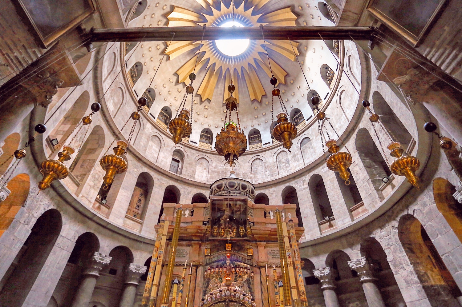 The Church of Holy Sepulchre, created in the 4th century, is believed to be the site where Jesus was crucified and also houses Jesus’s empty tomb, where he was buried and resurrected. The Church has survived centuries of reconstruction, though parts of the church remain original from the age of Crusaders, including the large, carved wooden doors composing its main entrance. The complex comprises the tomb, a great basilica, and a columned courtyard. Inside is the altar of crucifixion, and a passage that leads to the rotunda (or Anastasis) where the Holy Aedicule stands. Light pours dimly from its domed, ornamented roof, a remnant of its Roman influence.