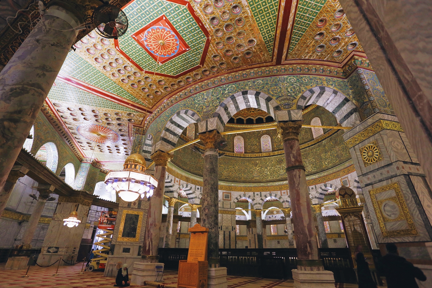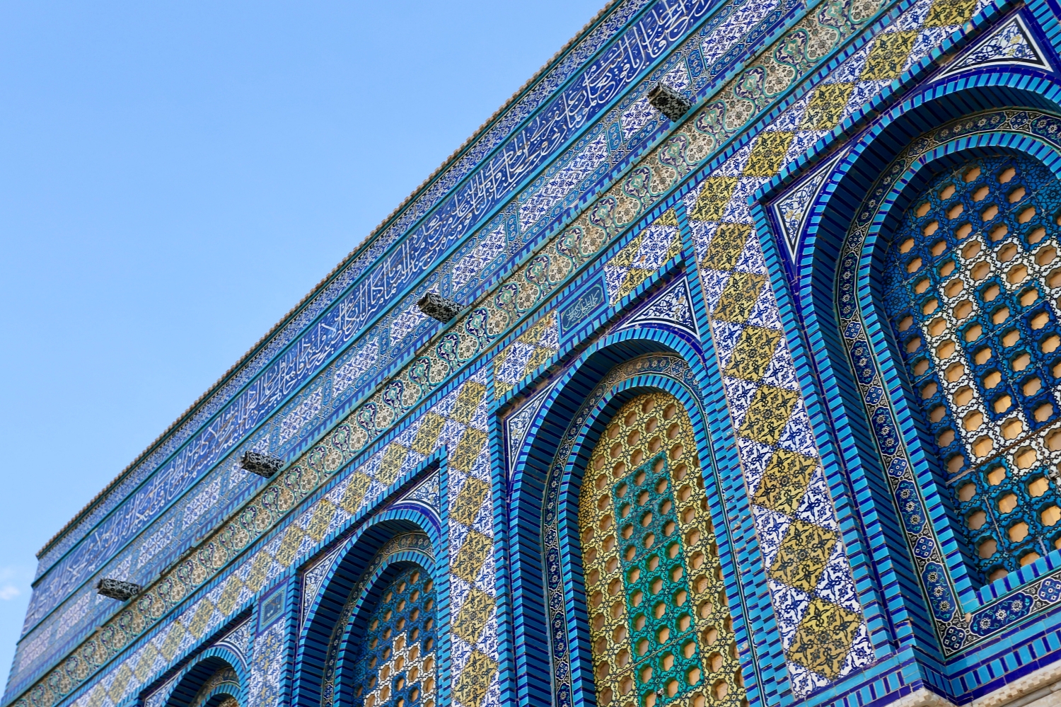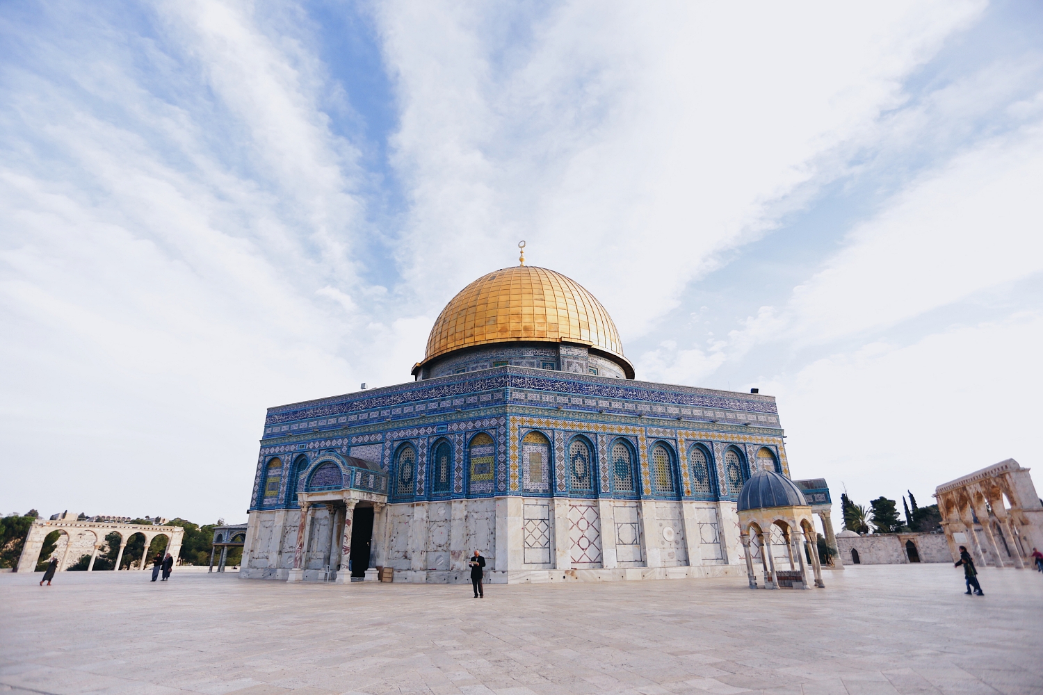 Dome of the Rock, a fusion of Byzantine, Roman, and Islamic architecture, sits on a flat elevated plaza, known to Muslims as al-Haram al-Sharif (the Noble Sanctuary), and to Jews as the Temple Mount (where the temple of Jerusalem once stood). Upon approach, the golden dome glistens, looming above 16 columns to form the mosque’s octagonal structure. The dome itself is made of gilt aluminium and bronze. On its exterior facade, intricate mosaics of detailed Quranic calligraphy and patterns are laid out in vibrant blue and yellow.
