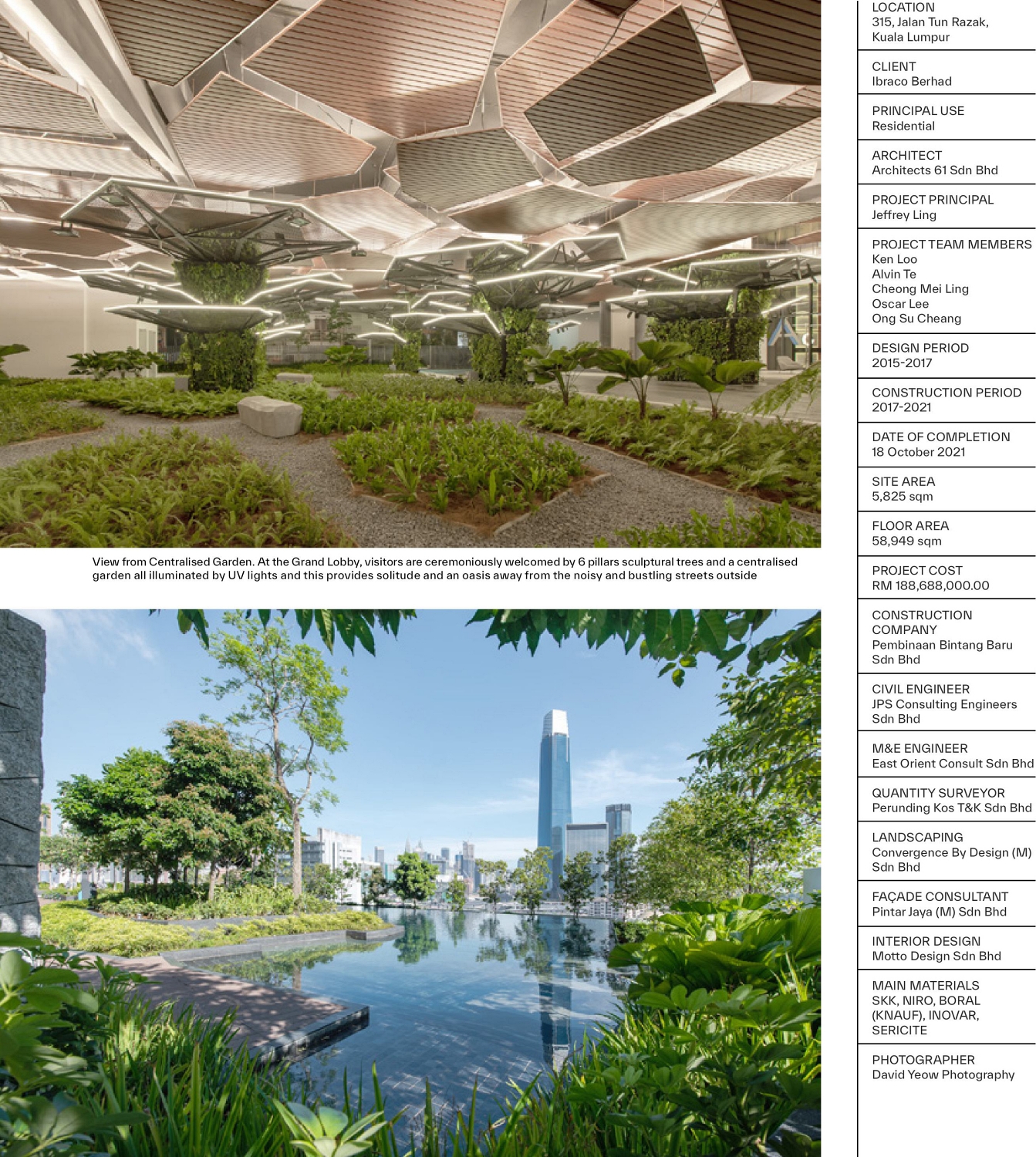 There are two entrances to the development and both entrances at Jalan Tun Razak & Jalan Yew lead to the Grand Lobby, a Centralised Garden and also directly to the podium parking. The Grand Lobby has a contemporary theme with the detailings adopting clean symmetrical lines and forms. Stone, mirror and timber finishes were extensively used to impart a sense of warmth and grandeur.Overlapping glazing with ventilation slots was introduced in most common areas including the Grand Lobby and lift lobbies allowing natural ventilation without the need for air conditioning.