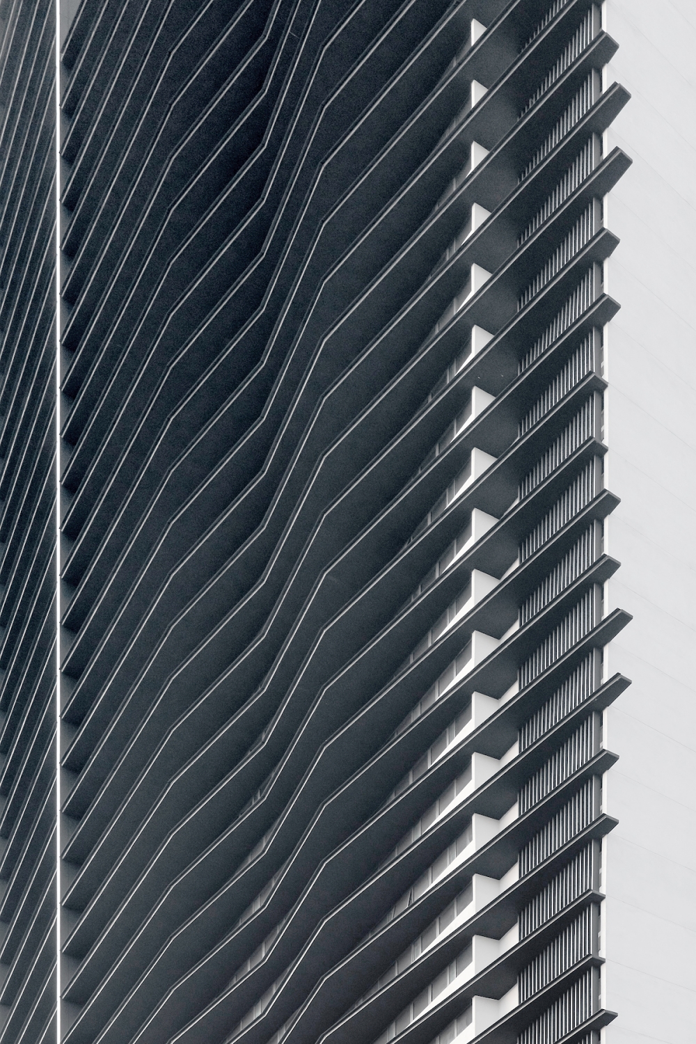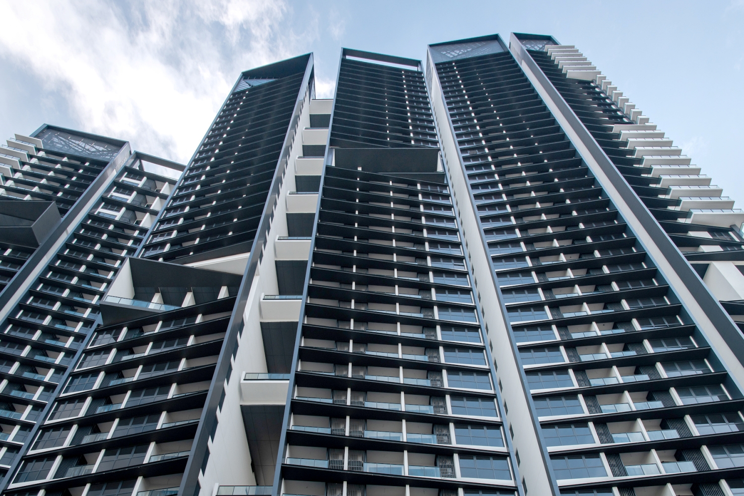 The apartments are housed in two separate towers with the façade playfully serrated and with the cascading height of each serration creating an illusion of multiple blocks.To further accentuate the building’s form and depth, slanting functional sun-shading hoods were added with L angles fixed at the edge to avoid rain streaks.In areas where there is a large extent of flat vertical surfaces, zig zag hoods were placed to break the monotony and the massive building form.Each of these zig-zag hoods comes in different lengths to create the ripple effects of a wave at the edge of the building facing Jalan Tun Razak, making it poetic.The serrated segregation of the layout of apartment units also allows more privacy to the tenants, thereby reducing noise transmission and overlooking the neighbouring units.