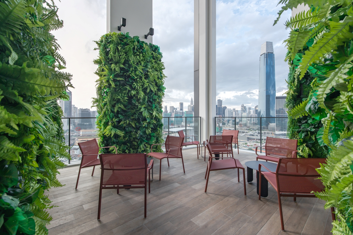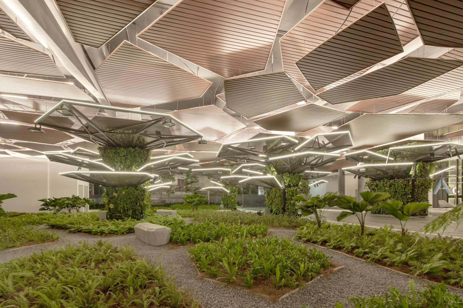 The landscape was conceptualised with the idea of creating a vertical forest within the heart of this concrete jungle.The inspiration for the form and shape of these “trees” draws from the canopy shape of the Dryobalanops tree which was further developed by adopting basic polygonal planes layering them on top of each other with grow lights concealed amongst the ceiling panels to encourage growth.Creepers were then planted on the metal mesh of these planes which “forms” the canopy petals of the tree.This feature is unique to Continew as there are not many indoor gardens in any residential development especially at such scale and size implemented successfully and thriving.