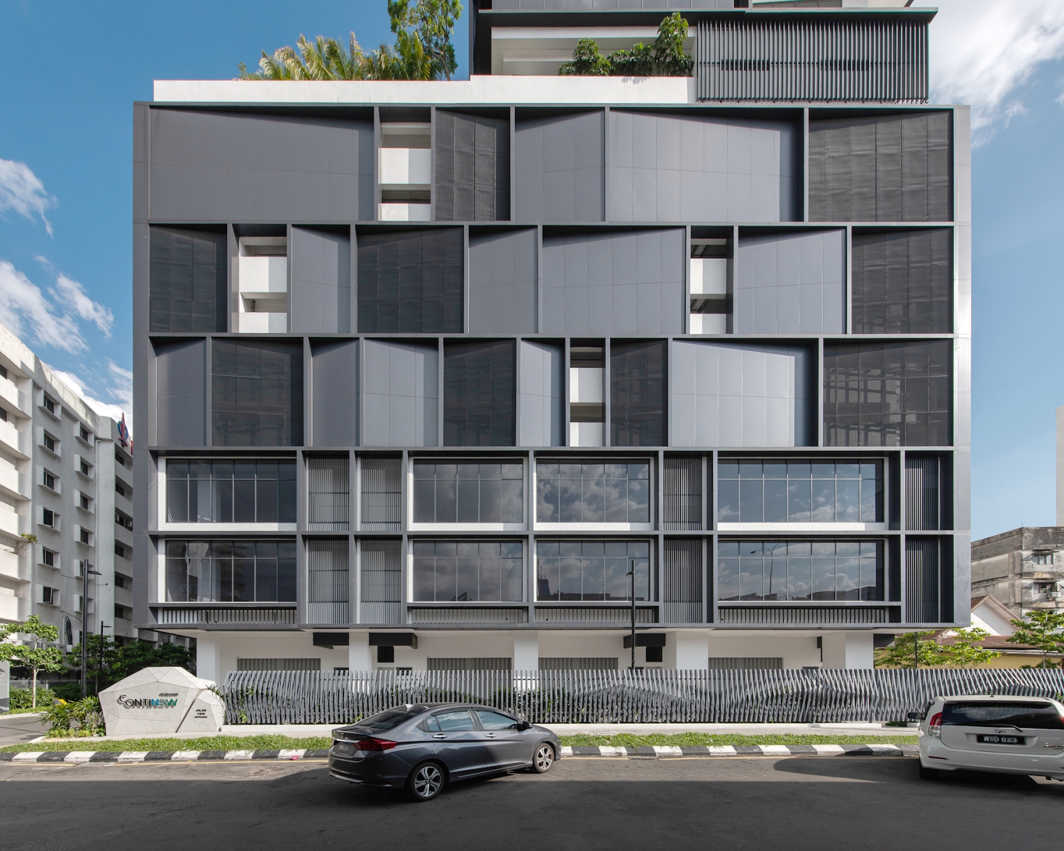 The overall architectural form of Continew takes cues from the site footprint shaped like a butcher knife, a coincidence symbolism to the adjacent Pudu market.The three-dimensional form of the building was conceptualised using facets of angular trapezium that were consistently adopted throughout the façade to accentuate its shape.This was further developed, elevating the concept further with the three-dimensional and sculptural form with slanting and folding planes at the Sky Lantern, Sky Lounge and Sky Deck that culminate the cascading top of the building.