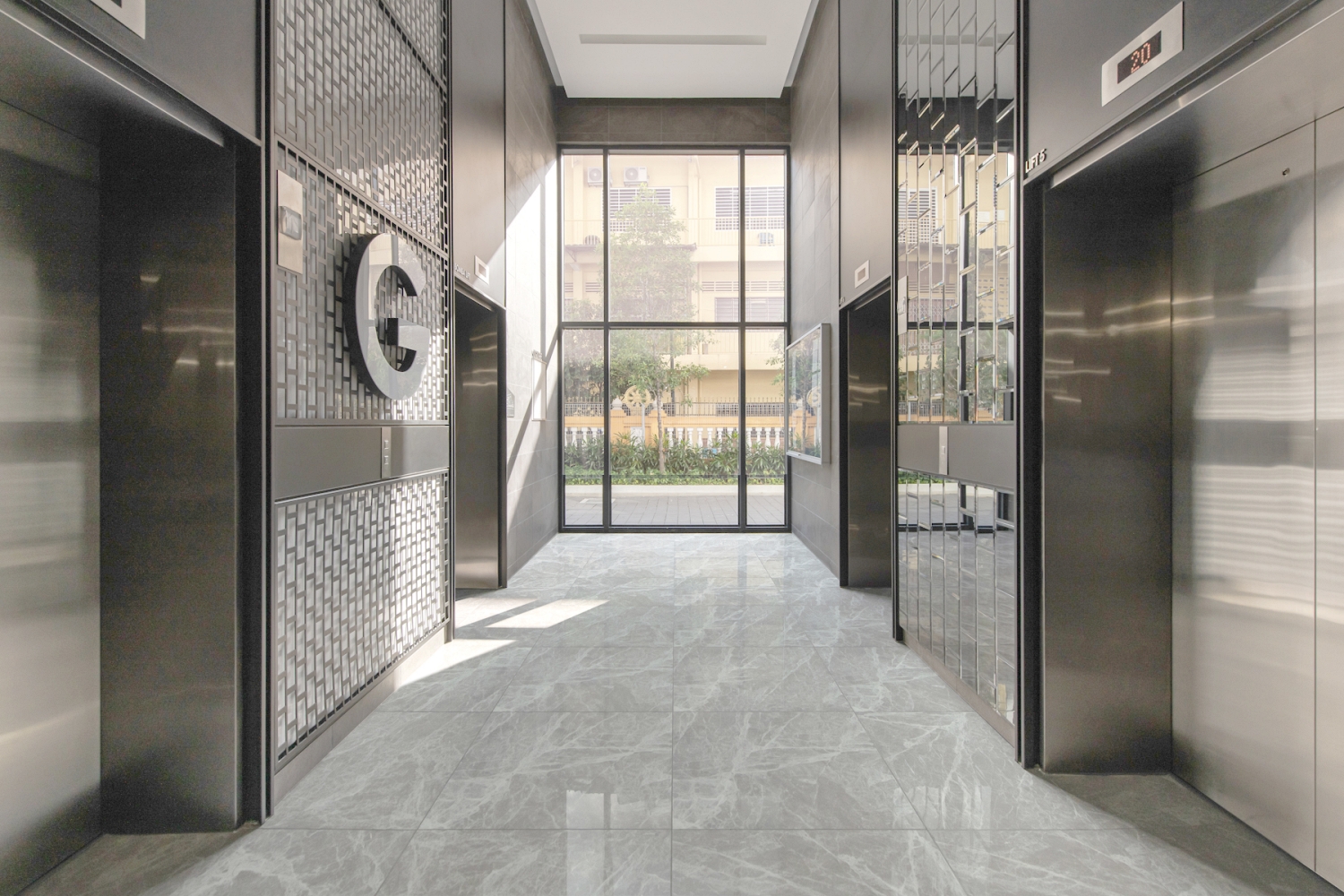 Ground Floor Lift Lobby. Double panel of overlapping glazing are placed at common area such as the lobby to allow for natural ventilation and reduce the usage of air conditioner and fan