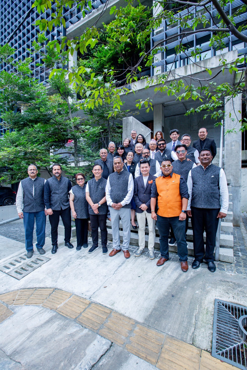 Group portrait of the outgoing and incoming OB/CCs at the steps of PAM Centre.