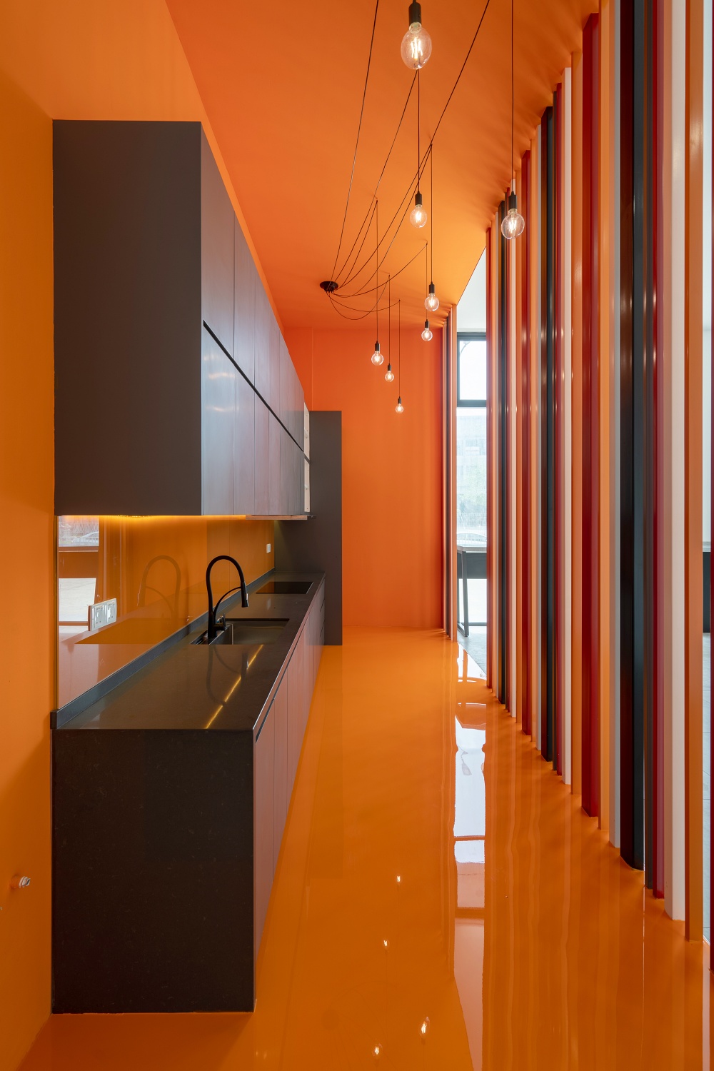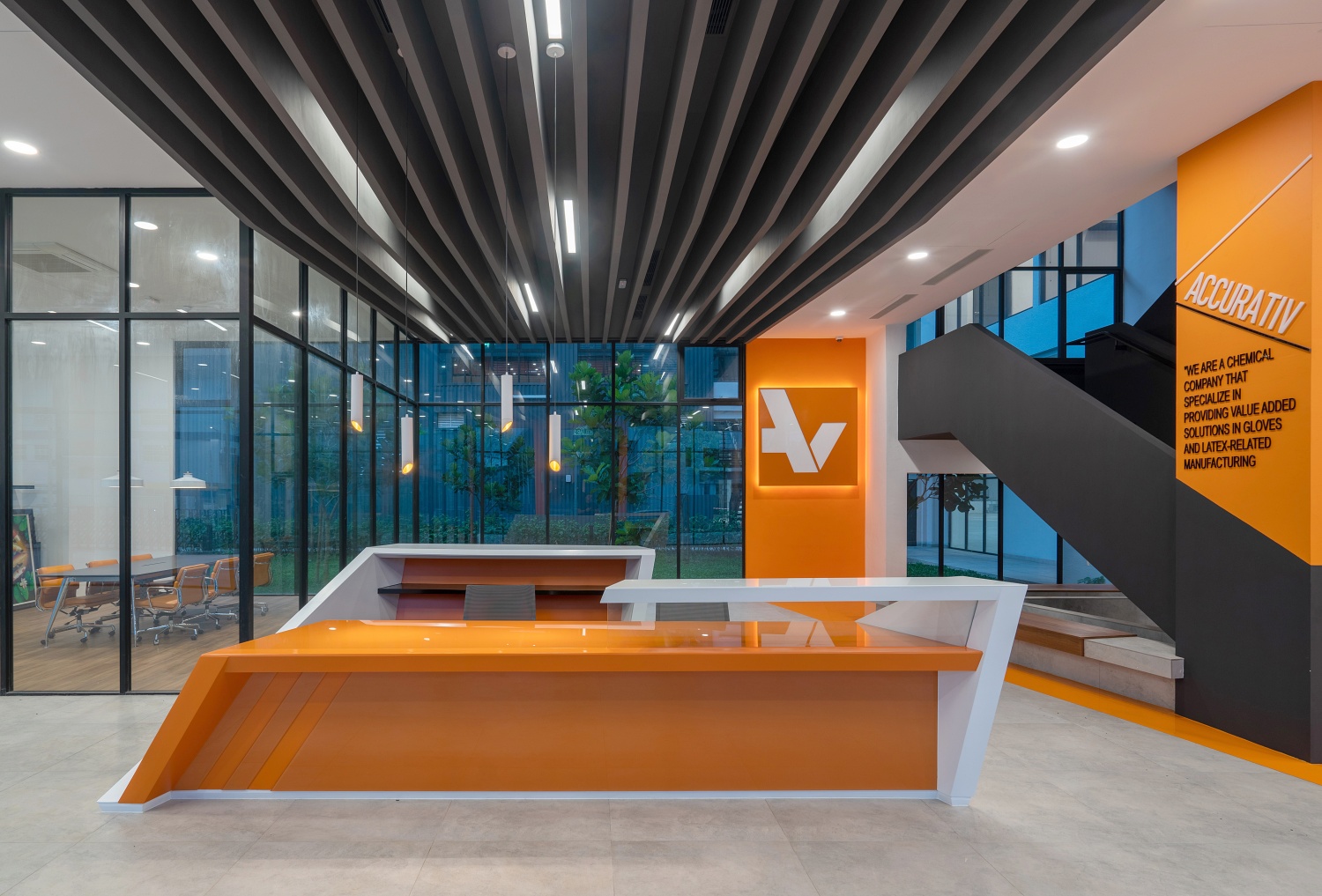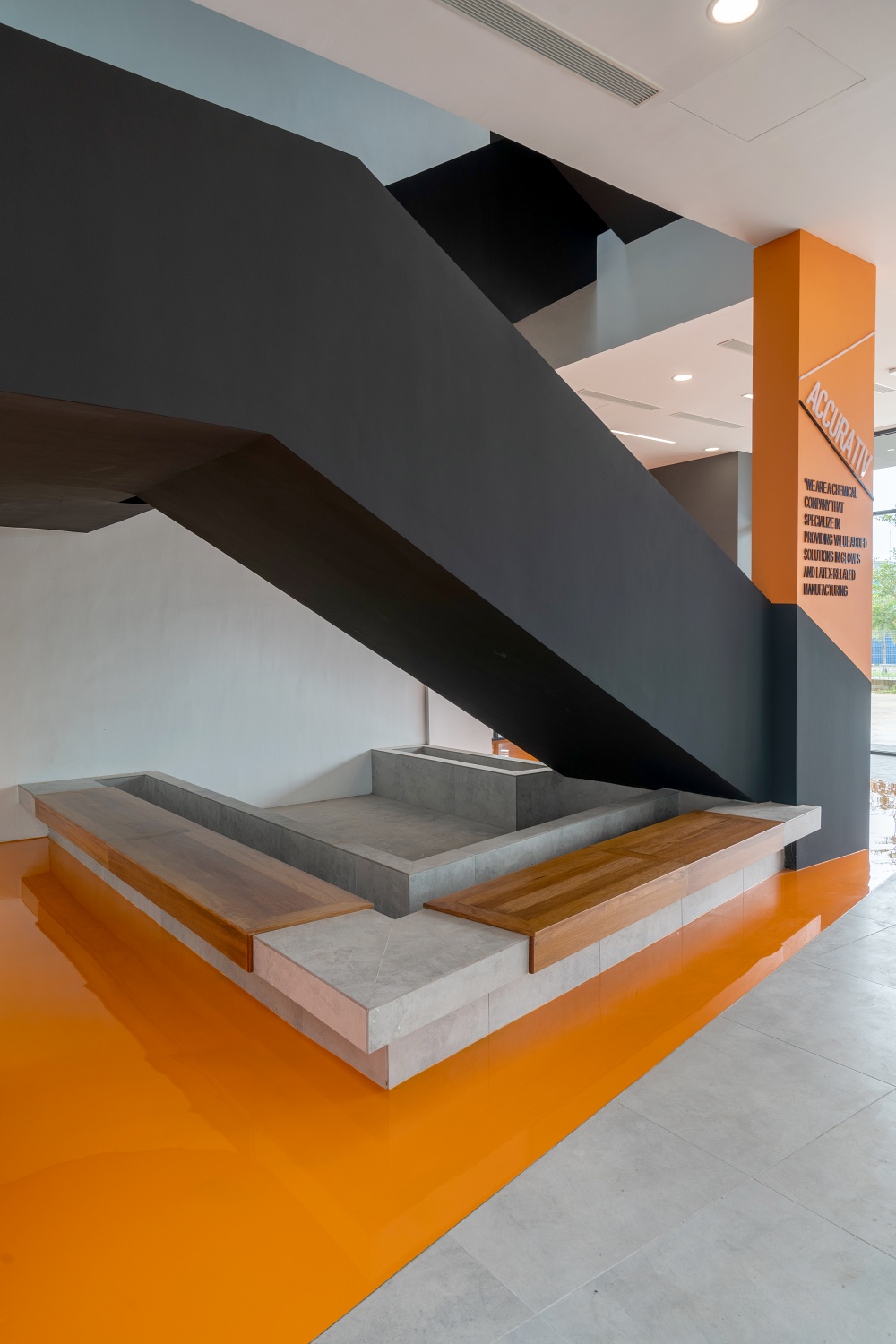 Interior design is another important aspect of this building design as a means to enhance the brand identity. Dark grey was selected as the main colour of this building to create a stronger identity and personality. It also contrasts with the corporate colours of the company namely orange (the main colour), and red (the secondary colour). These two colours are used sparingly on the office block interior to create emphasis on certain areas of different functions. Last but not least, a touch of nature was also introduced in certain areas such as the timber flooring at the balcony area and seating below the main central staircase on the ground floor, to create warmth and additional connection to nature. Together with the uniquely custom-designed reception counter, this dynamic play of colour, texture, and design magnificently portrayed a creative and energetic vibe, strengthening the brand identity of Accurativ (M) Sdn Bhd.