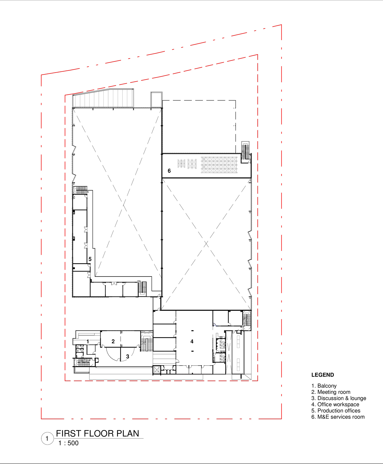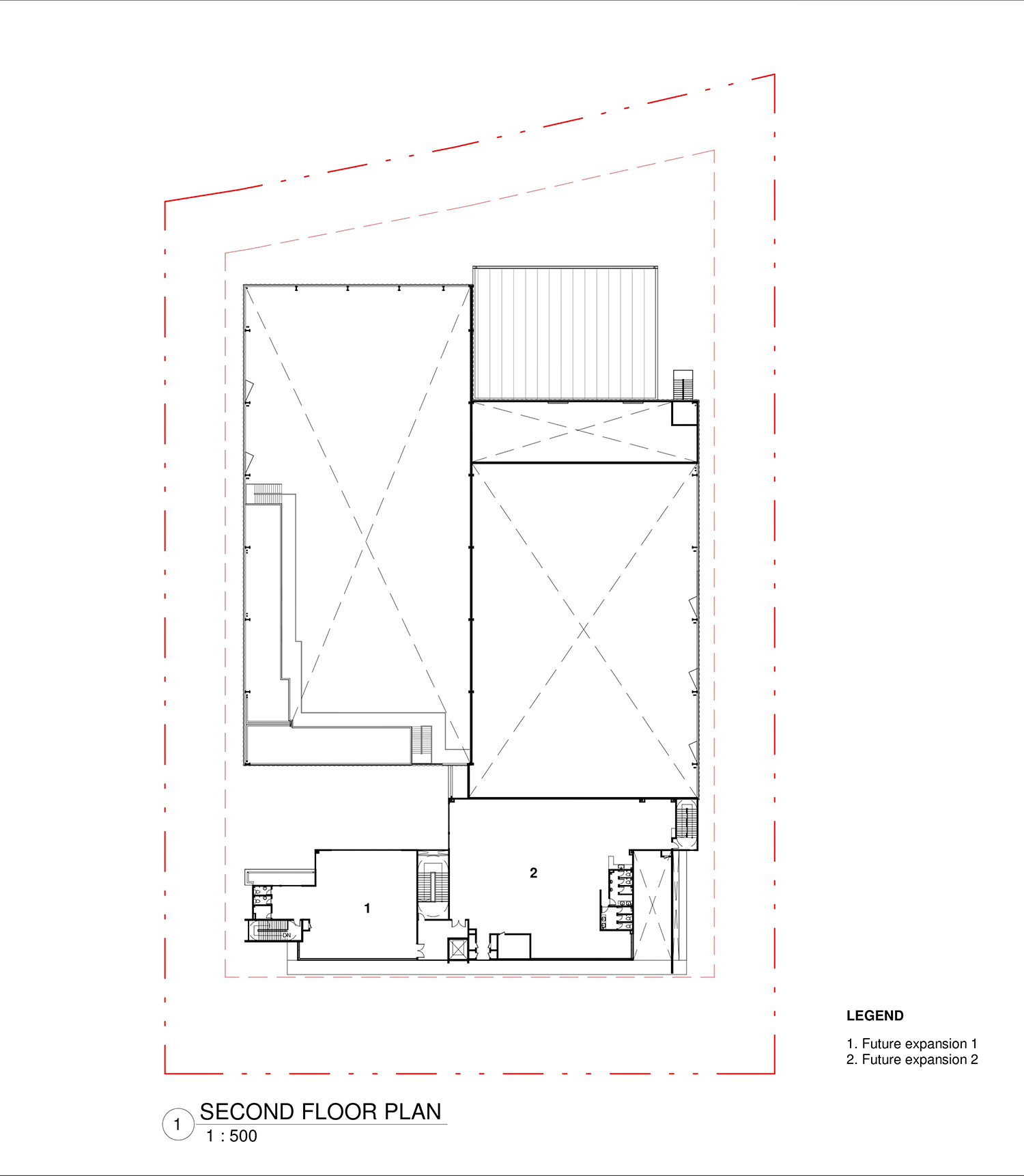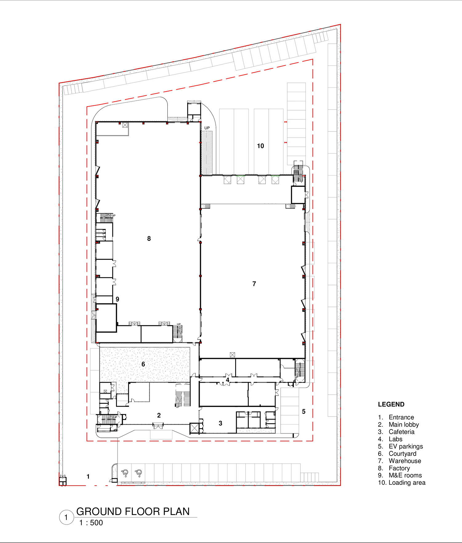 Sustainability is another emphasis of this building design. Green spaces, solar-responsive building orientation, natural daylighting, and natural ventilation are the few passive design strategies adopted to create a sustainable manufacturing facility. The office block with the cafeteria area was designed to face south to allow maximum glazing and windows for natural daylight, yet minimize heat gain. For the warehouse façade that faces east and west, only a few recessed and tall windows were provided to allow deep natural daylight. A layered roof with skylights design was also incorporated to achieve the same intention. Besides that, the roof was designed to induce stack e-ect ventilation which improves the thermal comfort of the interior. The central courtyard on the ground floor and the balcony garden on the first floor also contributed to the passive cooling of the overall building.
