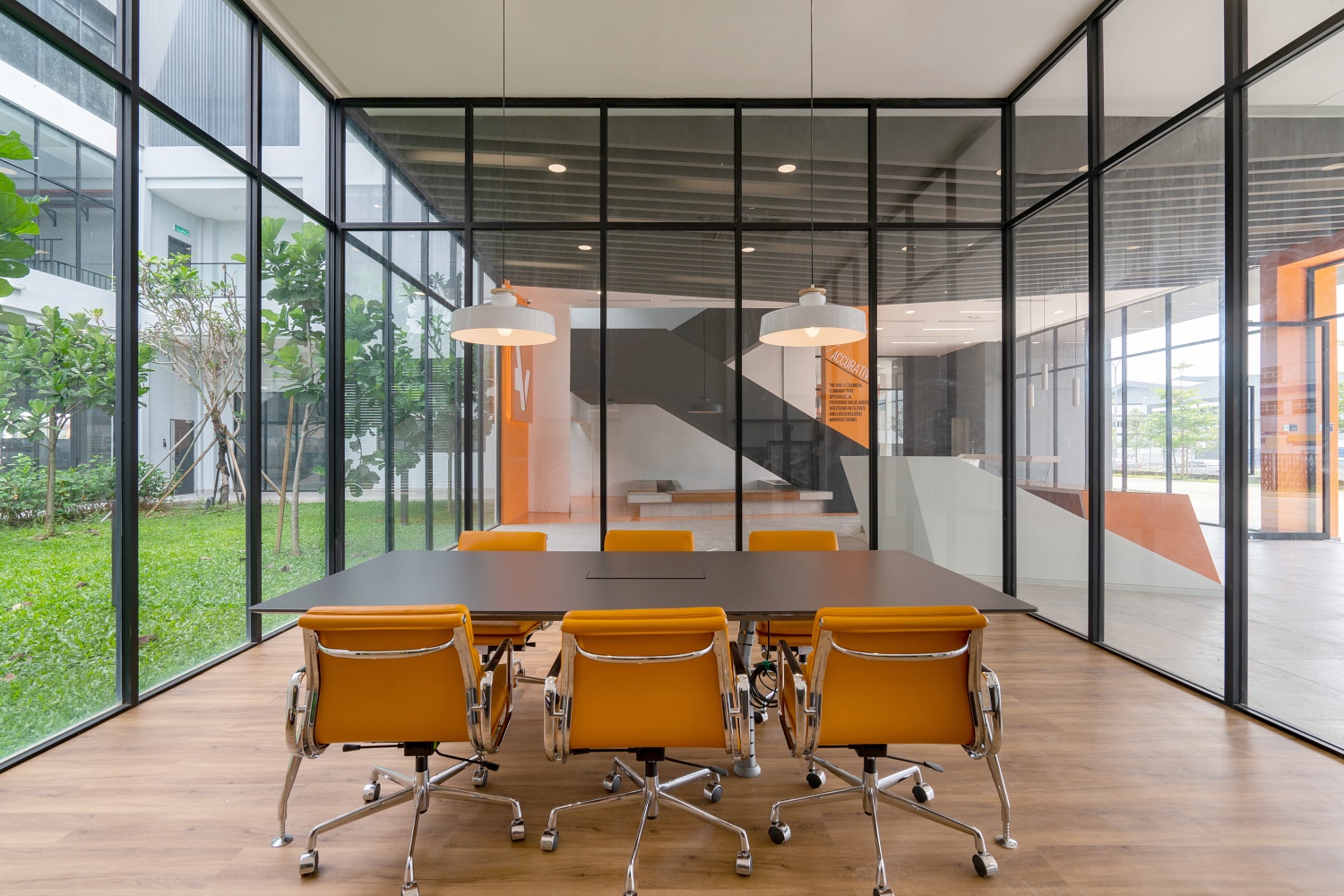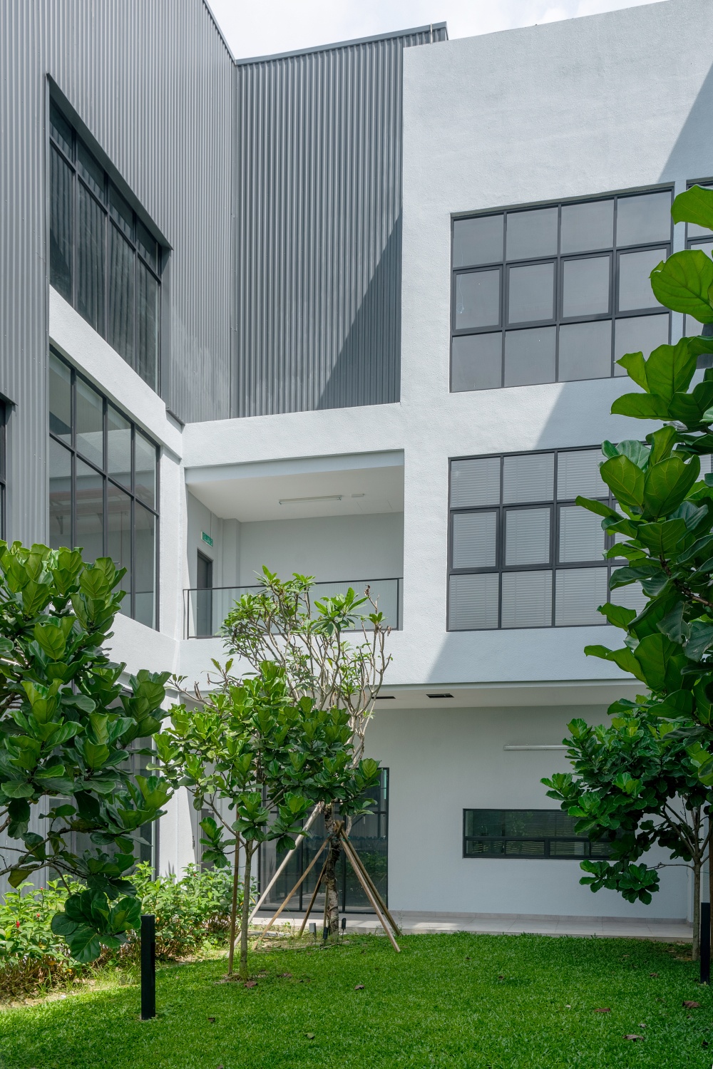 In terms of spatial planning, the courtyard also acts as a transition space between the office area and the warehouse area, making it an interesting journey as one moves from one space to another. The beauty of this greenery is even captured and magnified at the entrance lobby, by framing the view using full-height glazing at the entrance lobby. At a glance, it appeared to be a picture of a beautiful garden, creating a warm and welcoming feeling for the visitors the moment they entered the building.