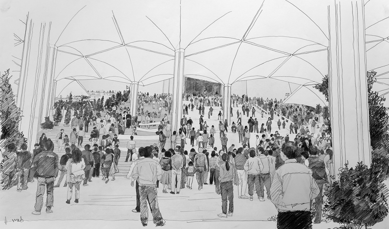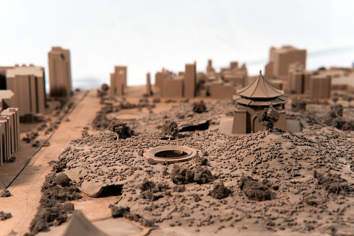 The concept of “multiplied grounds” presents an opportunity to create a new form of public space within the historical realm of the Chiang Kai-shek Memorial Hall. By reimagining a reconfigured surface environment as a dynamic, multi-layered landscape, the design proposal seeks to transform the space into a hub of diverse experiences and interactions. Elevated park structures draped over modular units form a sprawling landscape resembling Taiwan’s mountain, providing opportunities for walking, playing, and exploration. Beneath this terrain lie shaded playgrounds, performance spaces, and cafes, amplifying the park’s size and functionality. The gradual slope from Liberty Square to the memorial hall integrates the park seamlessly into Taipei’s skyline, offering distinct areas for leisure activities like outdoor screenings and live performances. This vision transforms the cityscape into a vibrant cultural hub, designed by and for the community. Within this enriched public space, the shifted statue of Chiang Kai-shek (see Glorification Shift) finds itself as one element among many, sparking curiosity and inviting reflection. The arrangement fosters open dialogue, inviting individuals to share their perspectives on history and engage in meaningful exchanges.
