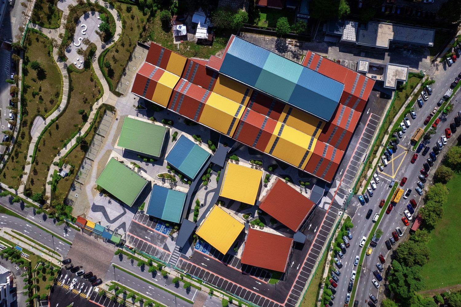 Aerial View of SAMA Square showing vibrantly coloured retail and market spaces uniting under one roof