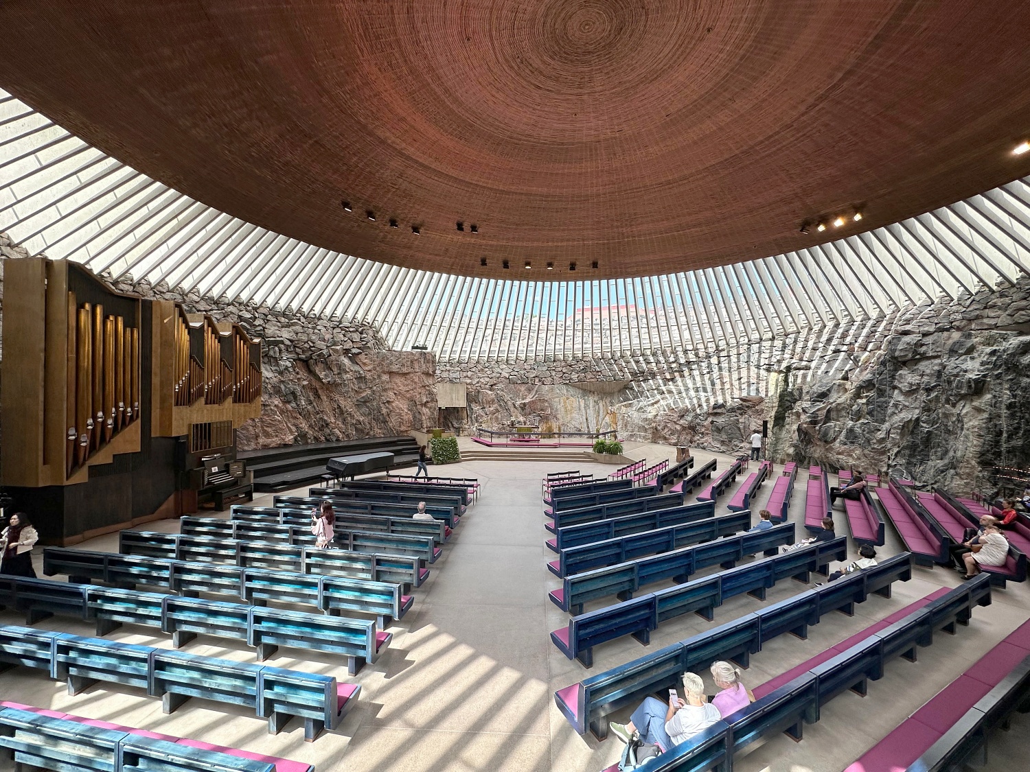 Next, not too far away, is the Church of the Rock, known as Kivikirkko, designed by Timo and Tuomo Suomalainen, brothers who were architects in the 1960s. Amidst an outcrop of rock from the outside, the entry led to a phenomenal church hall embedded in the stone. The elliptic church hall is bathed in daylight, and it passes through the hall from the narrow skylights between the rock wall and the copper ceiling dome of 24-meter diameter. The inner surface of the dome is clad in copper tape, requiring a length of 22km. A chime melody composed by Taneli Kuusisto is played in the church, replacing the bells.