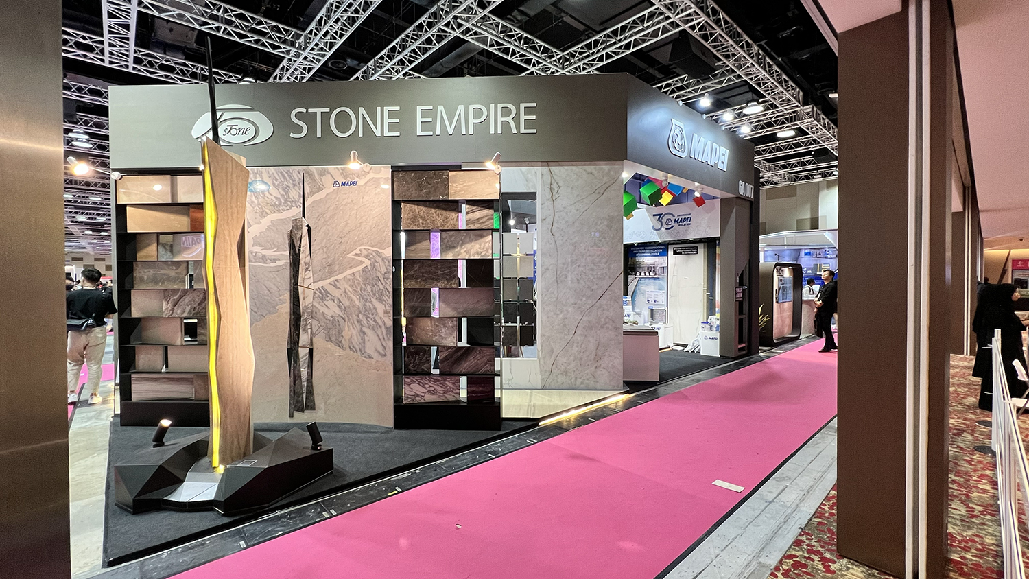 Ar. David Teoh’s design for the Stone Empire & MAPEI Booth at ARCHIDEX 2024 is a masterful celebration of stone in all its forms. The concept aimed to showcase the extensive range of stone products provided by the client, who also supplied stone for the iconic Merdeka 118 tower. The centrepiece of the pavilion honours this landmark, featuring cladding in travertine and a sintered stone material called Neolith. One of the booth’s standout elements is the quartz wall, which is semi-transparent and backlit to create a captivating visual feature. This illuminated wall can display a spectrum of colours, enhancing the pavilion’s dynamic aesthetic and demonstrating the versatile beauty of stone materials. Through this design, Ar. David successfully combined product showcase with architectural artistry, creating an engaging and visually striking exhibition space.