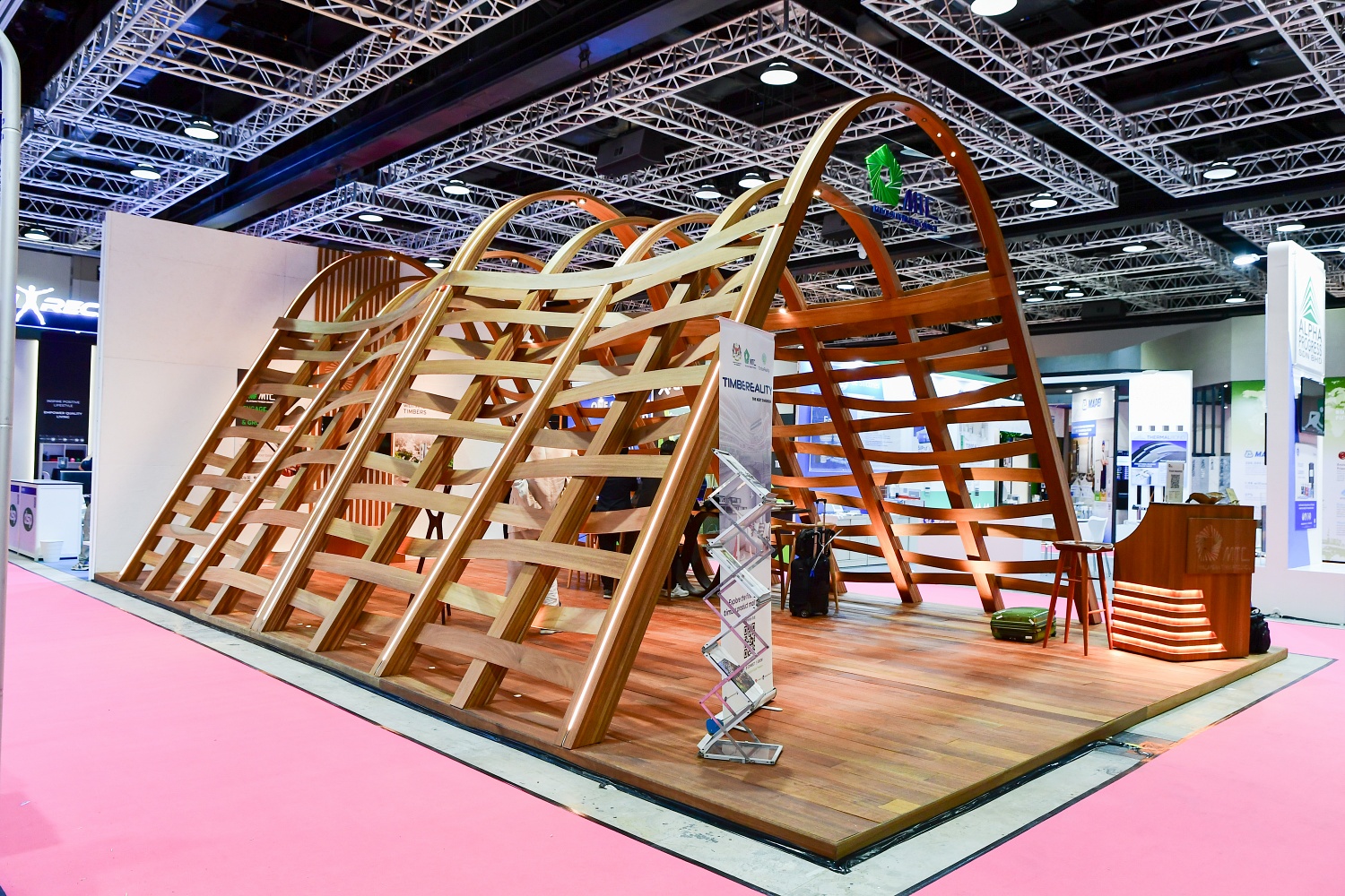 A captivating vision of woven wood, the “Weaving Waves” Pavilion, designed by Ar. IDr. Esmonde Yap for the Malaysian Timber Council, turned heads at the exhibition hall with its profound presence. This 60-square-meter structure celebrates Malaysia’s heritage and showcases the potential of Softened Wood. Featuring 10 elegantly curved ribs ranging from 3600 to 4000 mm in height, the pavilion’s design is inspired by traditional Malay basket weaving techniques. Woven wood interlaces between the ribs, symbolising the intertwining of memories and innovation.