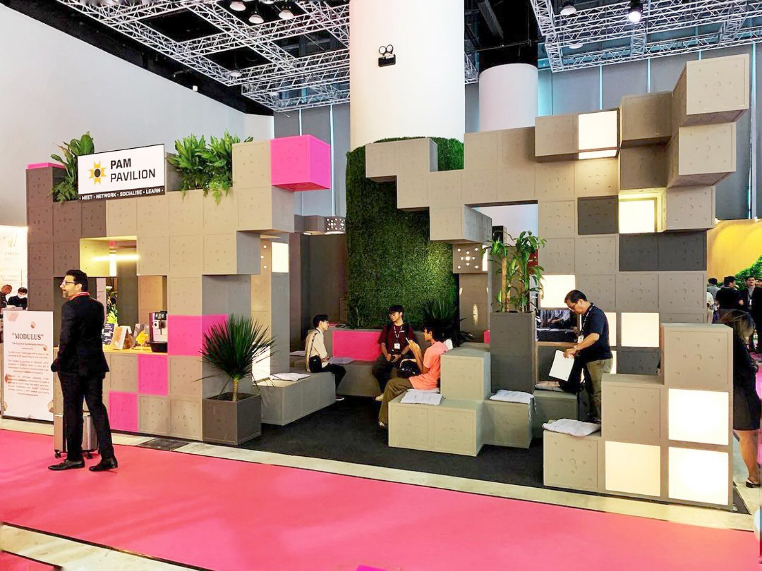 Named after the constant factor or ratio in mathematics, it embodies modularity through a grid of 450mm timber cubes. This 100sqm pavilion in Hall 8 features 623 cubes, each transforming into a seat, table, bookshelf, cocktail bar, planter box, display, stage, lightbox, and more. The colour selection steered away from PAM’s signature orange, and instead, it was accentuated with Pink boxes reflecting ARCHIDEX’s identity, an event that all architects look forward to each year. The pavilion became a vibrant hub, fostering impromptu meetings, business networking, and a variety of activities throughout the four-day event. “The Forum,” hosted within the pavilion, featured an impressive lineup of speakers who delivered their talks against the backdrop of the pavilion’s unique design. Ample seating ensured a comfortable environment for attendees, while passersby could catch snippets of the open forum discussions.