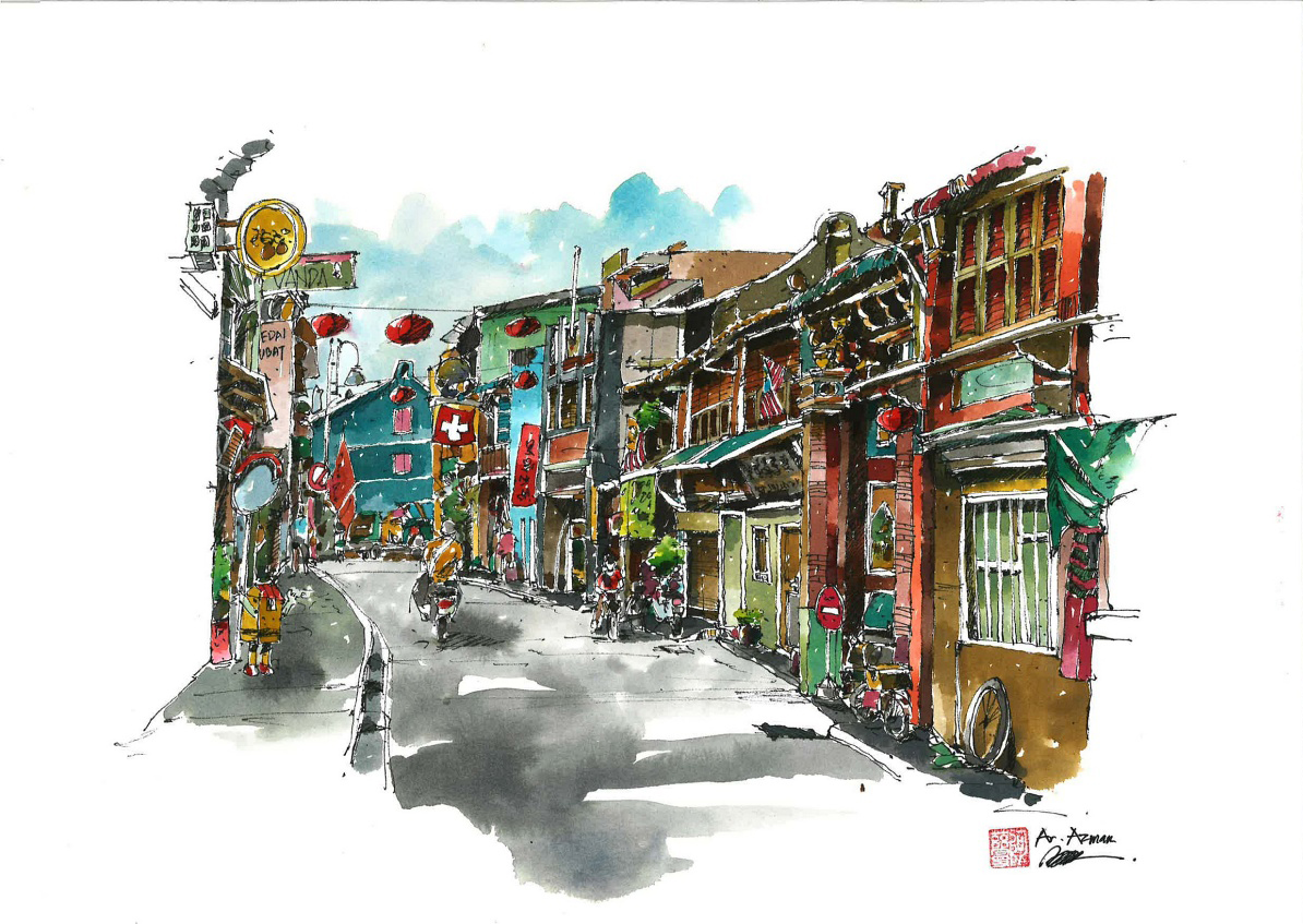 Normally, I would find the right time for me to start sketching. It has to be when I have the right piece of mind to ensure the quality of the sketch is as I have expected. Having the right mind and physical would help me to focus and apply the right techniques. There are times when I start the sketch on-site or even right in front of buildings. Everything has to depend on the availability of surroundings and when the weather permits me to do so. Other than that, there were times when I would take photos and start sketching at my studio. In any situation, my preparation would start with my sketchbook and pen. The audience of my work has been asking whether I would start all sketches using pencil as the first line. It has been my style of not using any pencil line to start the sketch with, nor using any eraser or ruler. I would be sitting or even standing to start pen line as it allows me to be free and that sense of freedom would enable me to see the subjects as their whole properties and record that on paper.