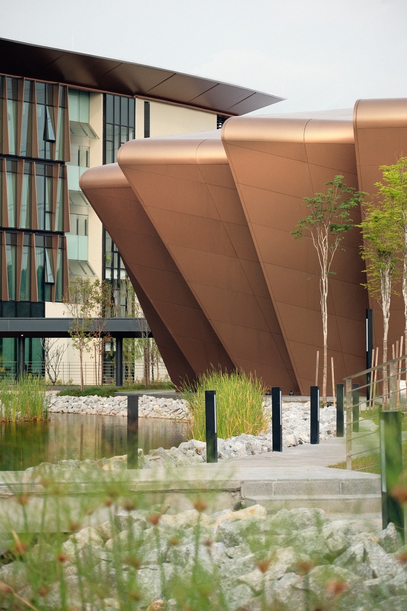 An architectural masterpiece, the bronze-clad surau embodies elegance and spirituality, seamlessly integrating with its surrounding landscape