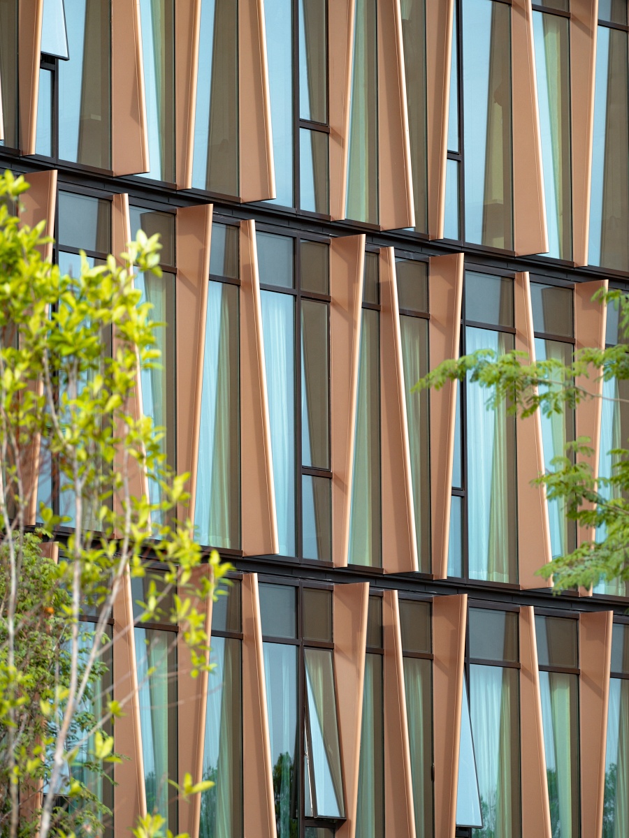 The staggered arrangement of the panels not only adds visual interest but also serves a functional purpose, likely optimising natural light and shading within the interior spaces