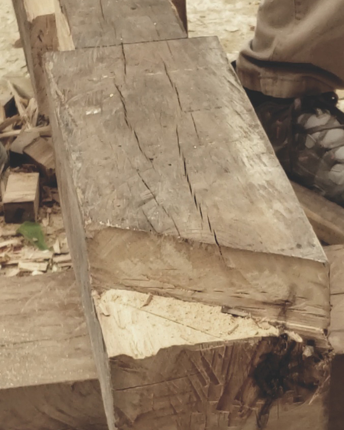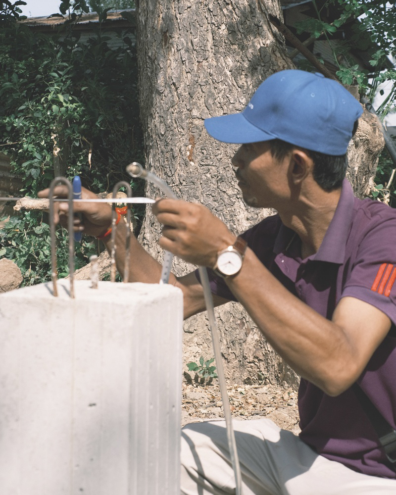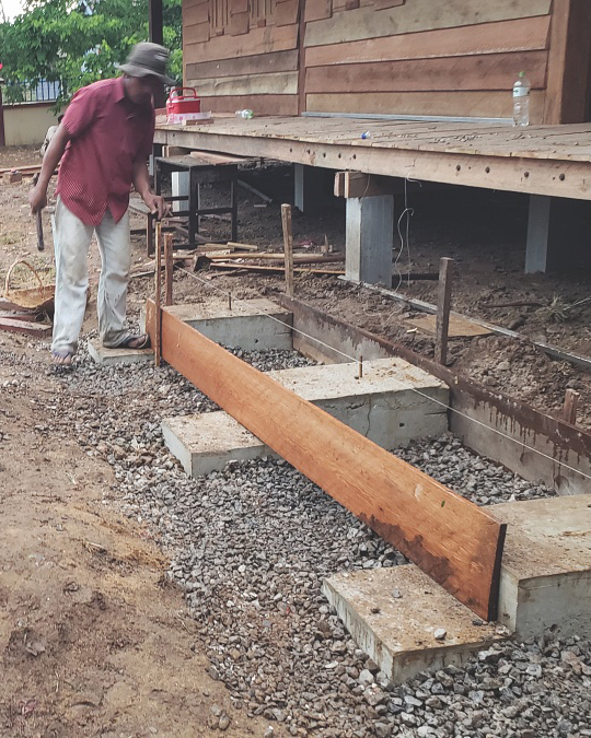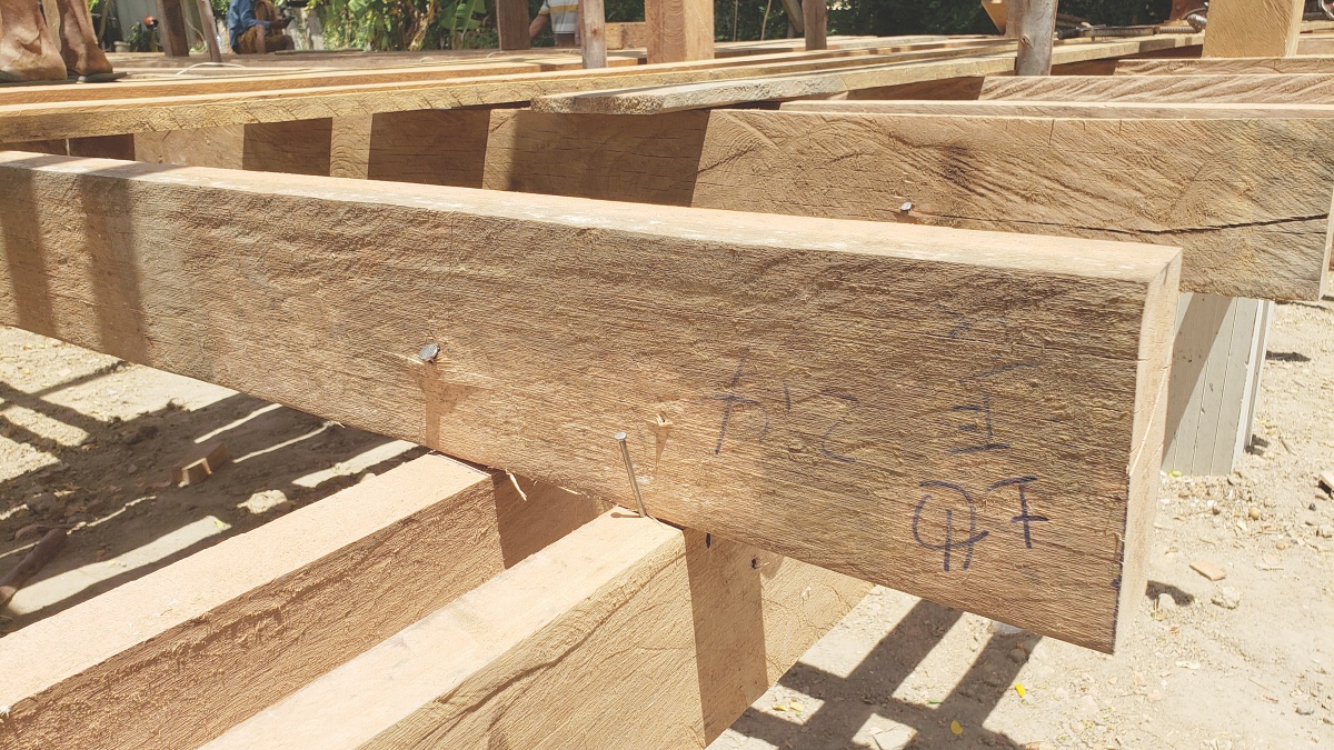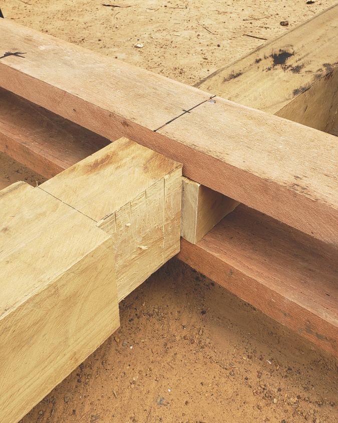 The following day, as the concrete had fully cured, we placed the concrete stumps on a layer of sand and used string level markers to help us align them accordingly. At the same time, we prepped the timber beams for the lap joints, with helpful inputs from the villagers who taught us about their techniques using an axe aleveled.