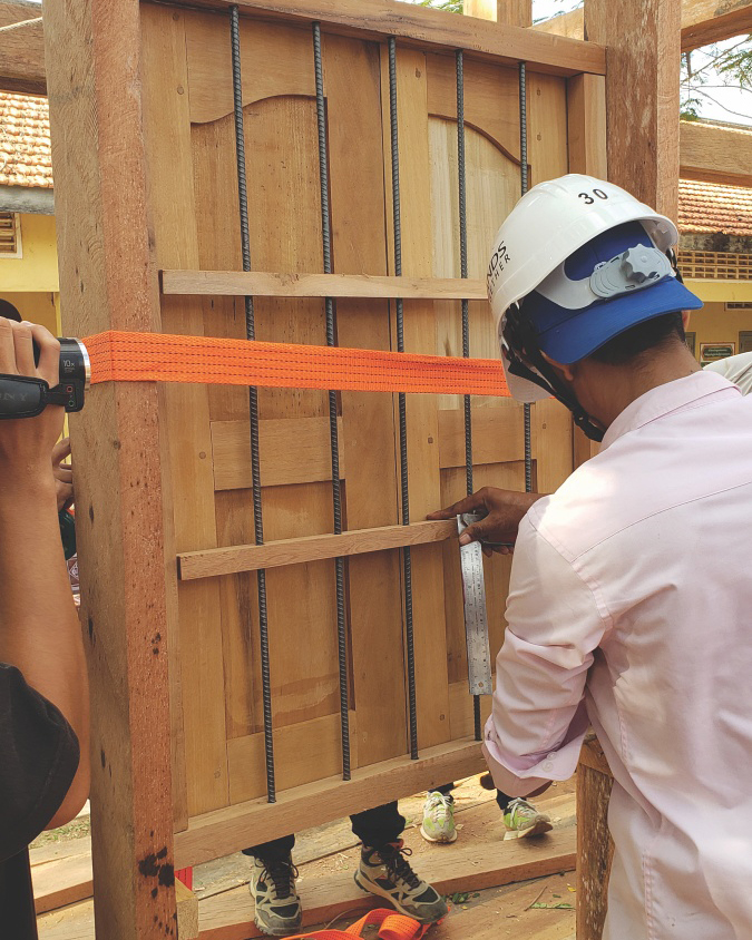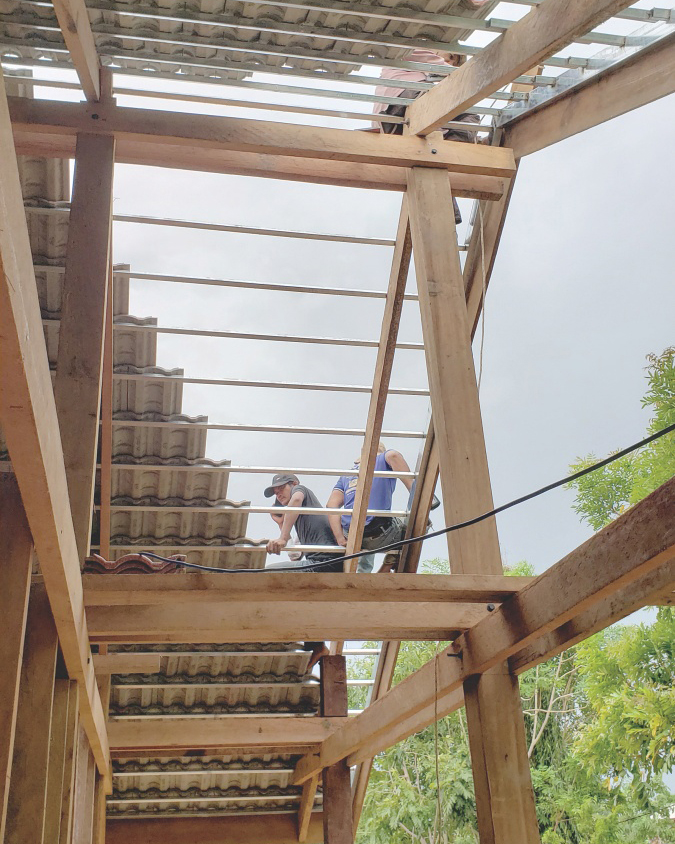 With the wall and roof structures nearly complete, our focus shifted to finalising both elements. Students attached overlapping wall planks for rain resistance, while local laid and nailed overlapping concrete roof tiles to prevent water leakage. A small group also began constructing staircase components, crucial for access.