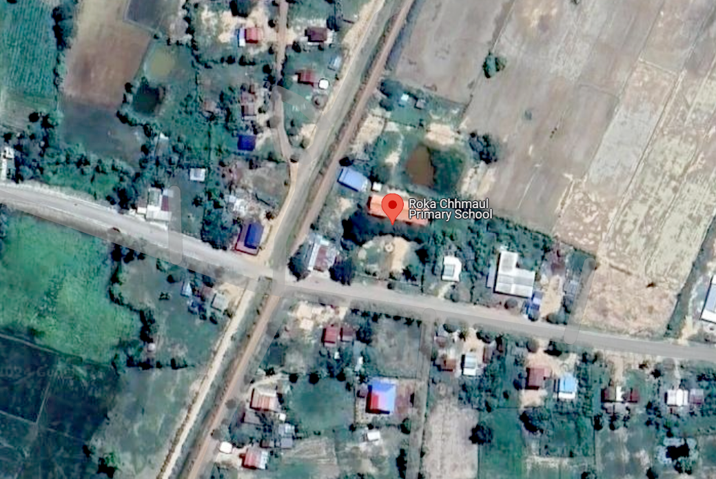 The aerial view shows Roka Chhmaul Primary School is located at the cross road, the building with orange roof is the existing school block, welcoming visitors with a front open landscape
