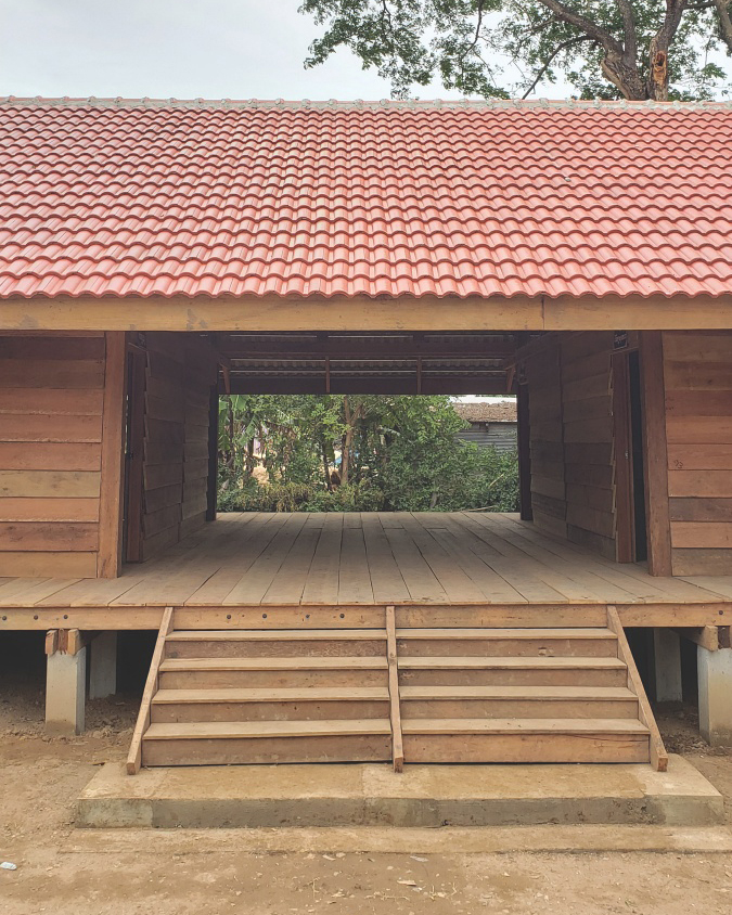 All the spaces in the school block are organised to respond to local site contexts. The classroom is located near the small vendor. At the same time, the health room is positioned closer to the toilets for easier sanitation. A covered open space at the centre facilitates multipurpose activities and provides shaded gathering space. The floor level is raised to 1 meter, as we were inspired by local children’s height, to promote ventilation and create an additional shaded play area for children. Covered corridors provide refuge from the harsh sun, and louvres at the gable end diffuse sunlight while keeping the rain out. Inside, built-in bookshelves in the library enhance functionality and create a welcoming learning environment. The design also incorporates local Cambodian cultural norms, such as including an odd number of steps in staircases and honouring local architectural customs.