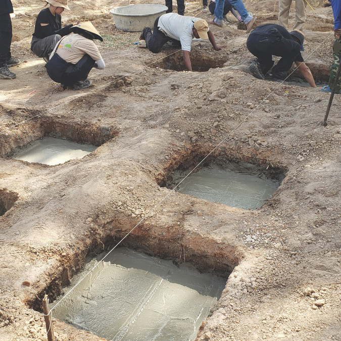 Everyone dug the ground for precast footings, filled the holes with stones and poured concrete. It was one of the most exhausting days, requiring significant physical effort and endurance in the local climate.