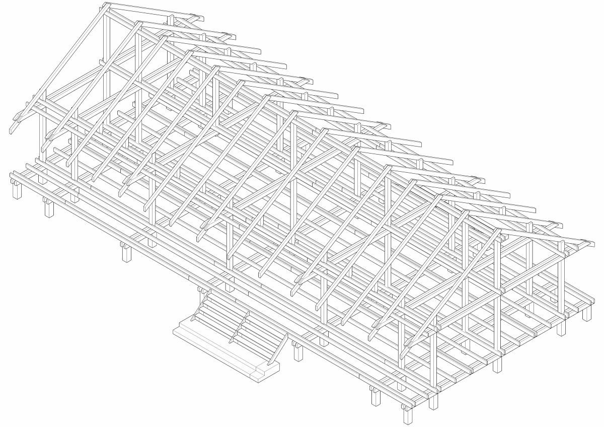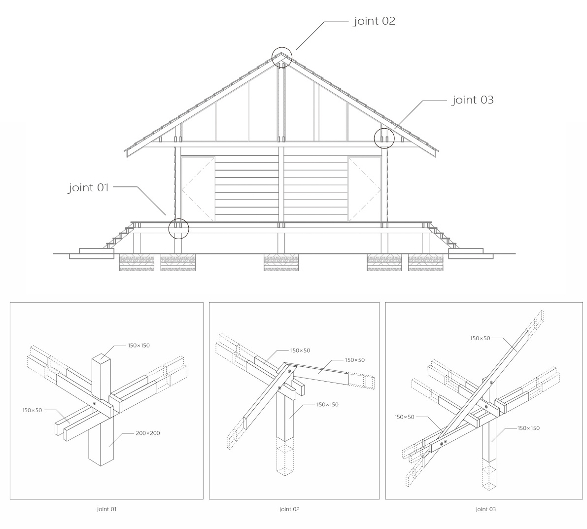 To streamline rapid construction, we drew on the local timber framing method, with strong regional and volunteer participation contributing to the success. Timber lap joints, where pairs of beams sandwich each column, were reinforced with metal fasteners, ensuring speed and stability. We also used locally sourced materials like precast concrete footings, hardwood timber, and prefabricated timber openings due to fast availability, allowing for quick and efficient construction.