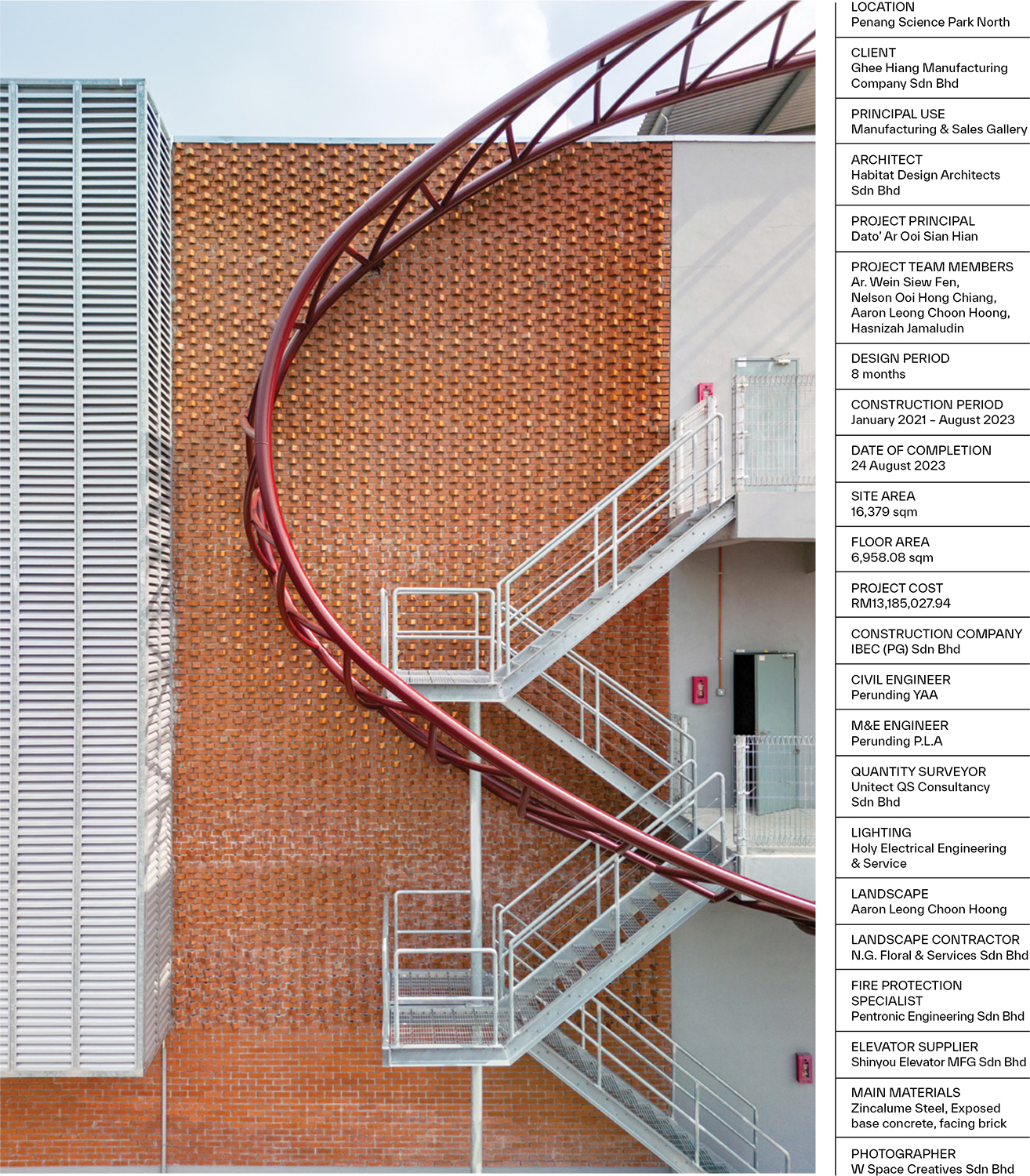 DESIGNED BY HABITAT DESIGN ARCHITECTS, GHEE HIANG MANUFACTURING COMPANY SDN BHD’S NEWEST INDUSTRIAL FACILITY SITS HUMBLY, FITTINGLY, YET DISTINCTIVELY WITHIN ITS INDUSTRIAL CONTEXT.