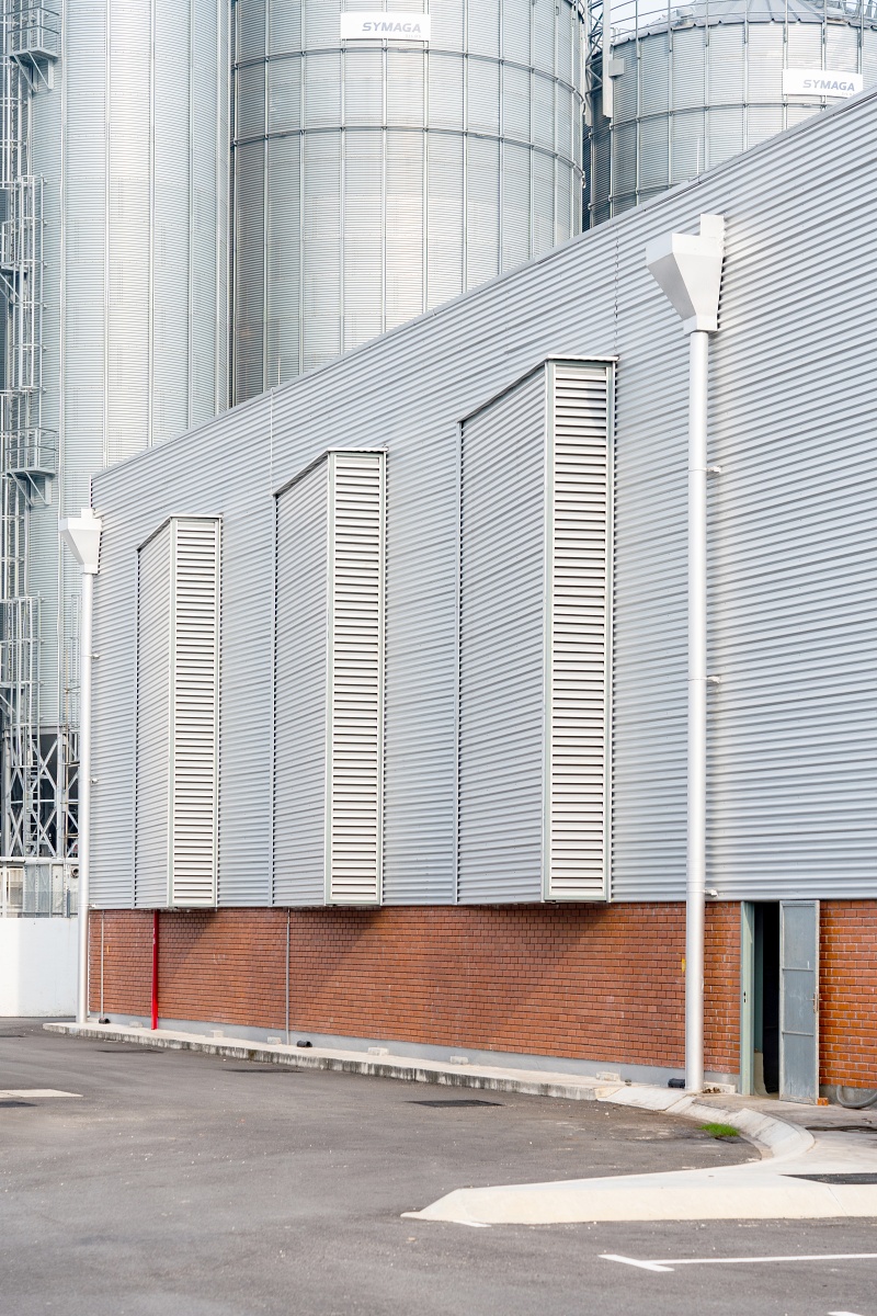 The entire facility is finished with Zincalume® wall cladding with exposed bare concrete and facing brick that demonstrates the honest approach to the manufacturing process. The patterned facing brick contrasts pleasantly with the selected cladding and different tones and shadows are noticed at various times of the day. With time, a natural patina will coat the surface of the brick façade.