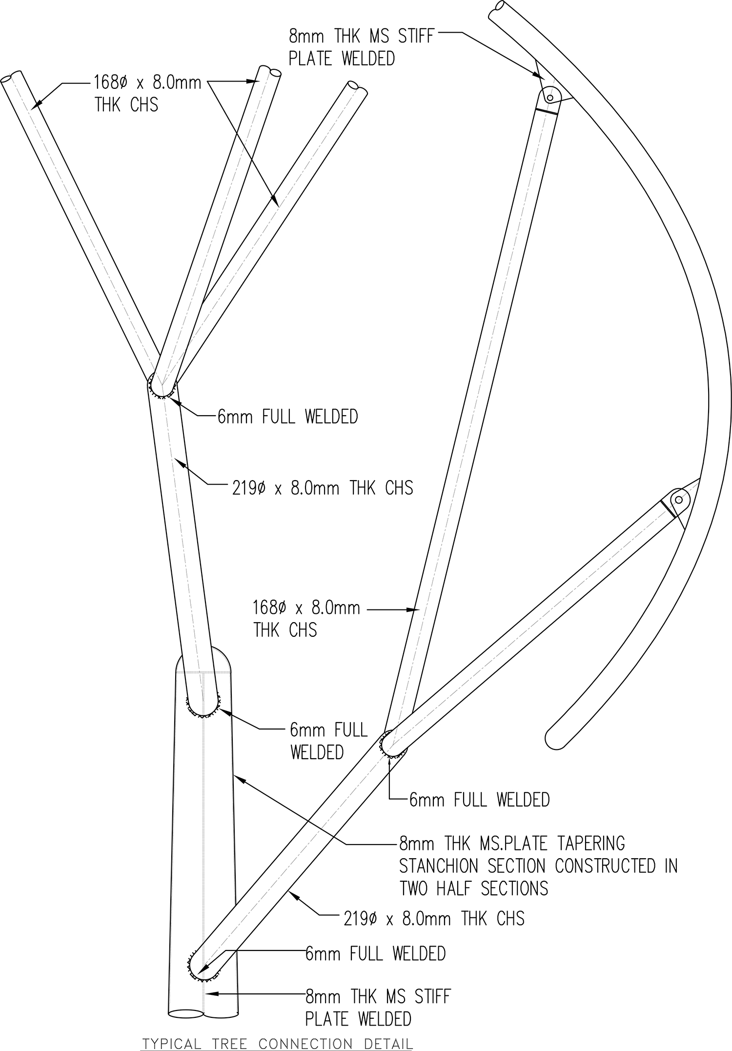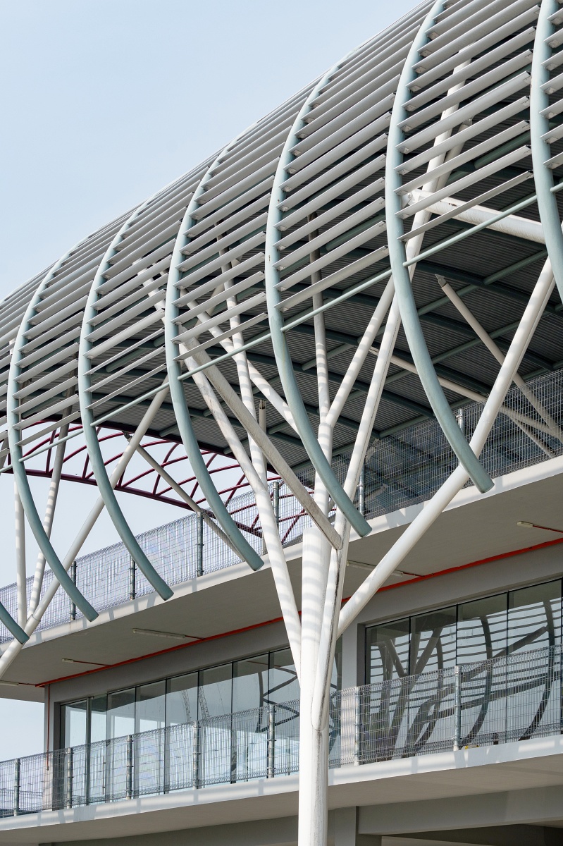 The steel columns, symbolising the Sesamum indicum tree, form the support for the curved roof