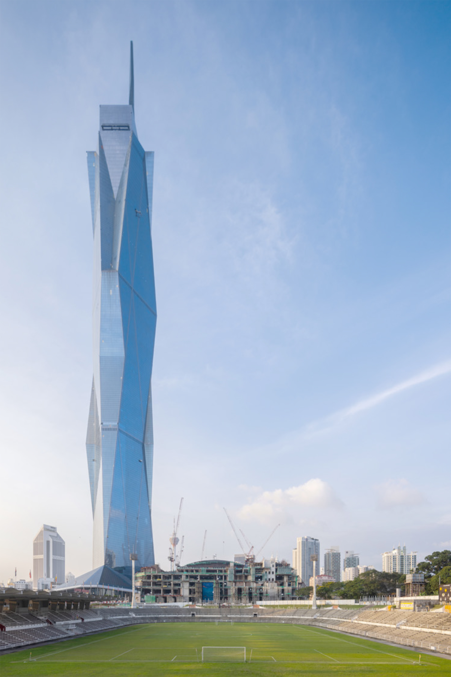 Diamond in plan, Merdeka 118 is sited on axis with neighbouring Stadium Negara to the east, and a new four-acre linear water park, designed by Boston’s Sasaki Associates. This car-free recreational area is designed to promote vibrant community interaction within the city for people of all ages and backgrounds.