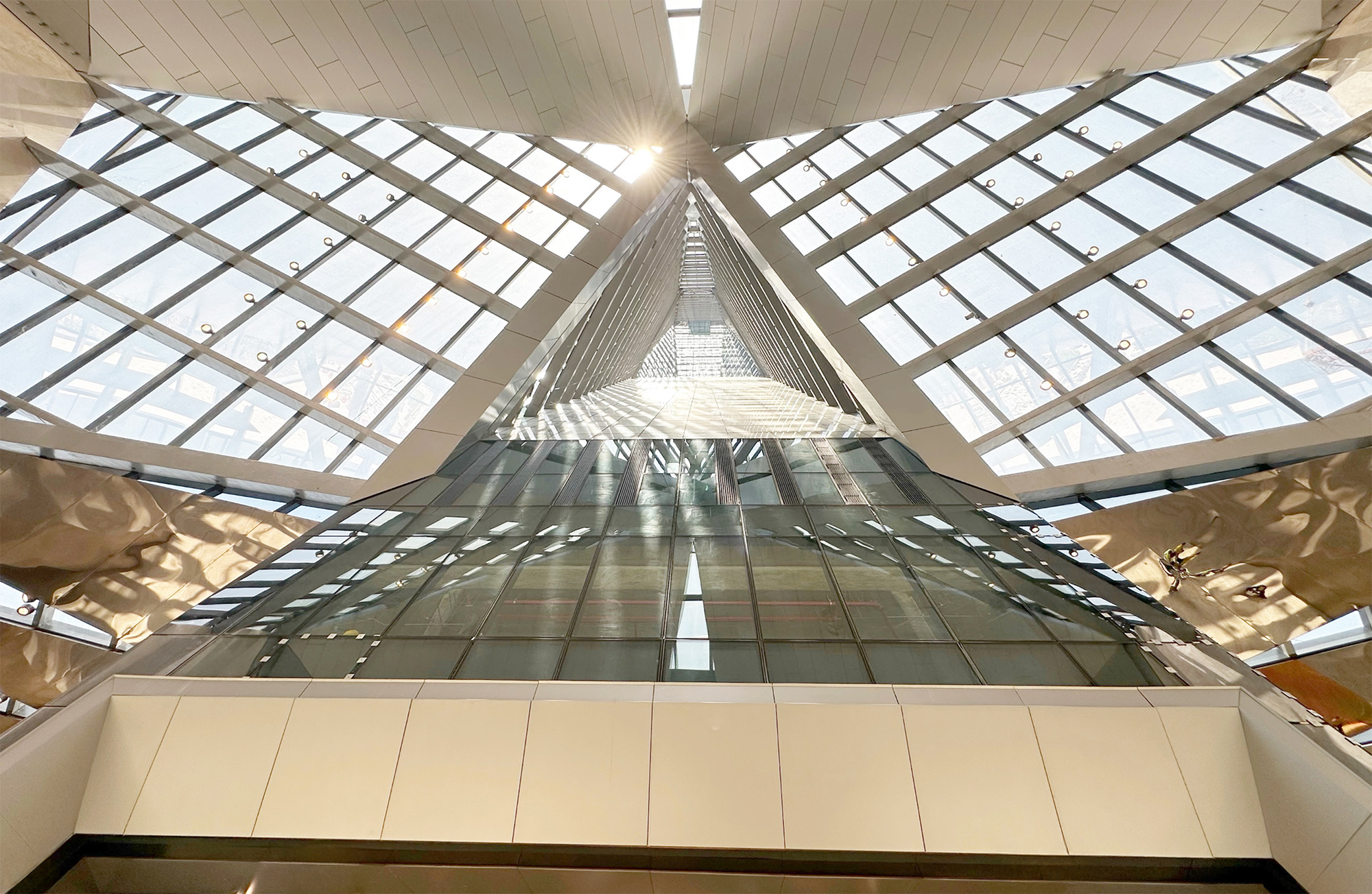 The design language of the tower element carries through to the podium exterior and the dual lobby levels of its interior. Lit via dramatic sky lighting, the immense volumes of these lobbies appear as if carved from solid travertine; the lower, to the north, connecting via escalators to the larger, more formal space to the south, notable for its soaring 35-storey atrium.