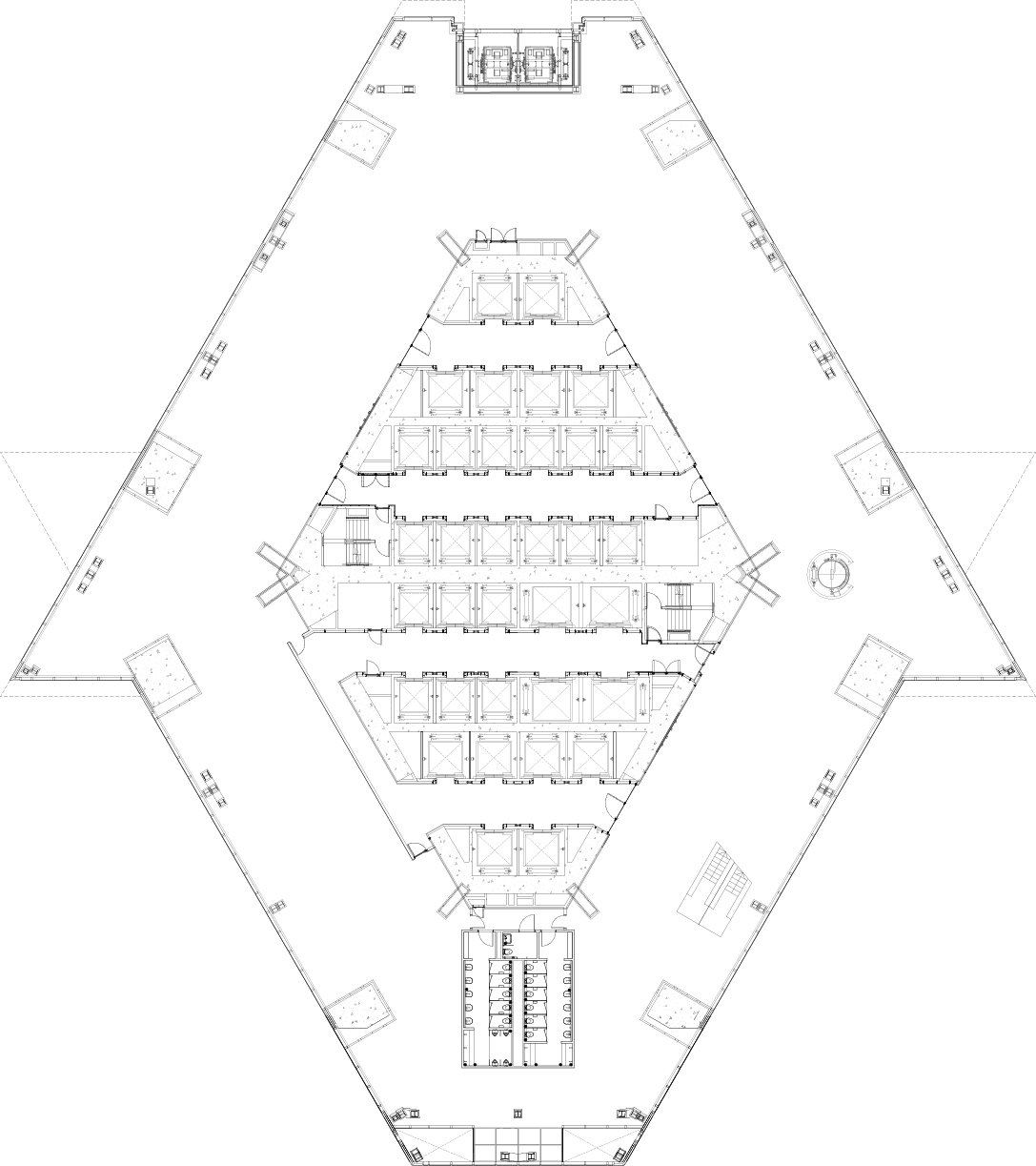 Working on a site of this scale required the project team to work closely with local authorities to improve the overall urban environment. The infrastructure surrounding the site was significantly upgraded to ensure a smooth vehicular and pedestrian experience in and around the precinct. Significant technical innovations embedded in the design ensure a sustainable, future-focused, and highly adaptable workplace that meets the ever-evolving demands of contemporary business. The carefully crafted plan shape, hybrid belt truss structure and faceted form efficiently distribute lateral wind loads whilst providing contiguous office floorplates unencumbered by columns.