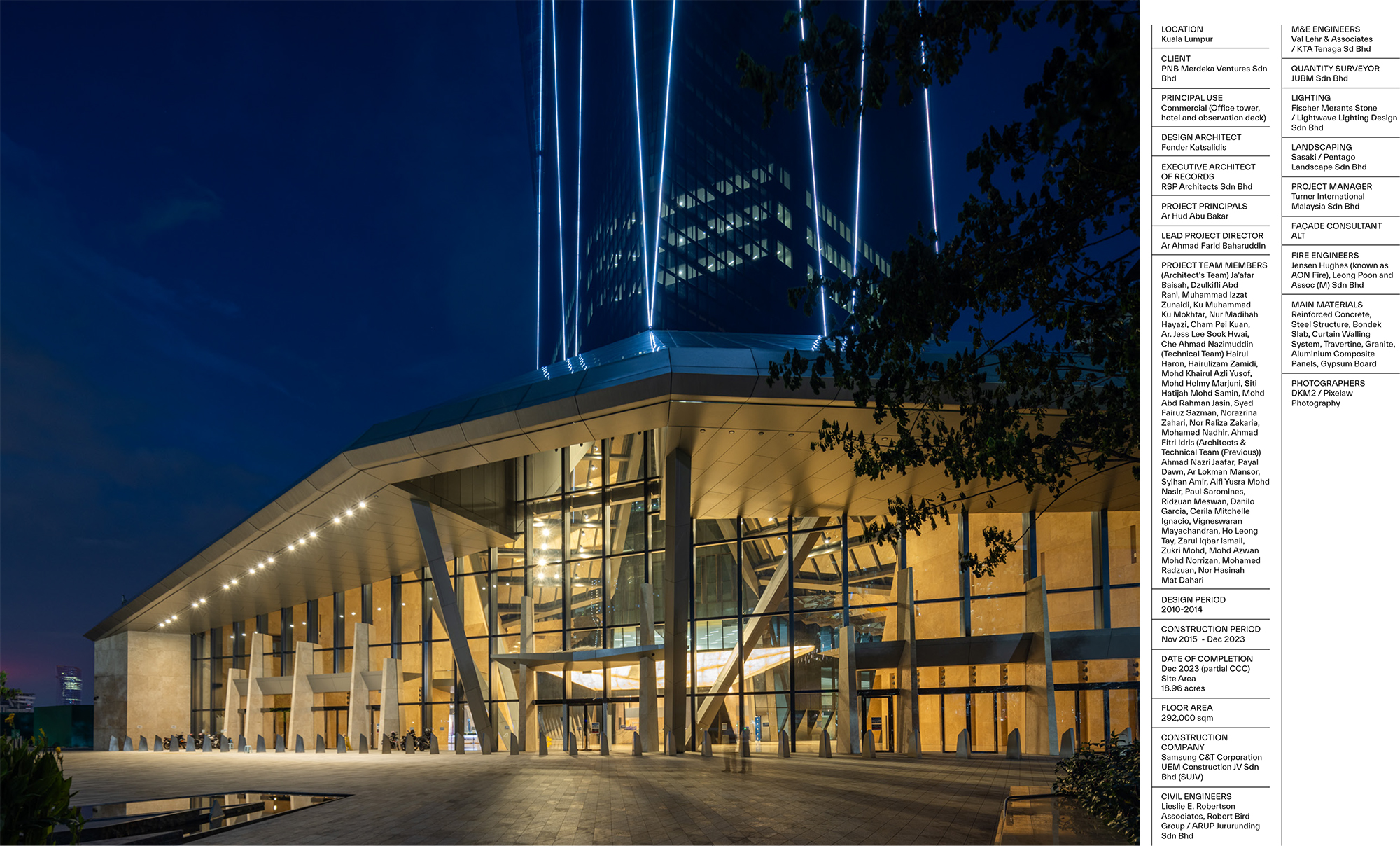 Developed for PNB Merdeka Ventures Sdn Bhd (PMVSB), a wholly-owned subsidiary of Permodalan Nasional Berhad (PNB), project collaborators included an extensive team of local and international design consultants. The tower was designed by Australian Architect FK in close collaboration with Executive Architect of Records RSP Architects Kuala Lumpur, design engineering firms Robert Bird Group and LERA (New York), and a host of other leading industry consultants. Its completion as the world’s second-tallest building celebrates the years of planning, problem-solving, collaboration and human endeavour required to realise a building of such ambition and complexity.