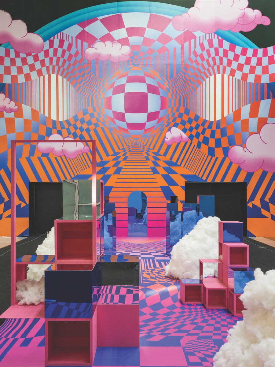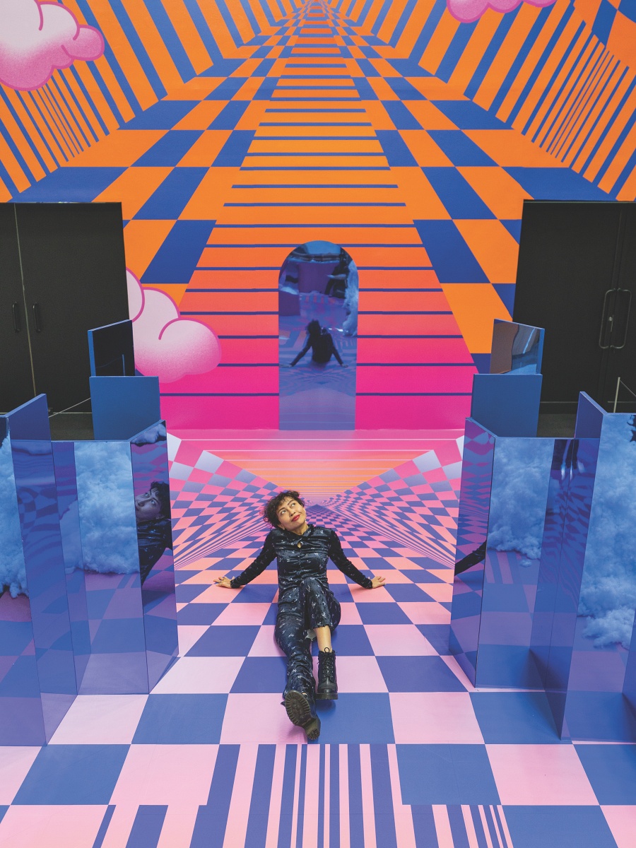 Her largest work to date, Theta, named after the brainwaves associated with deep relaxation and heightened receptivity, was presented at the KL National Art Gallery in 2023. Given full control of the project, she transformed the gallery’s lobby into a contemplative and whimsical landscape, created through reflective materials, bright colours, and dreamy illusion effects. The spatial piece examined ideas of subconscious creativity and human potential, inviting visitors to walk through, sit, and interact with the art. Its centrepiece featured a perspective view that focused towards a circle on the wall, covered in her signature warped grid pattern, indicating an introspective journey beyond the artwork. Tall blue plinths and piles of metal cubes were contrasted with a scattering of white cotton ‘clouds’ on the floor, giving the space a textural depth and conveying her message of a path’s obstacles and hope.