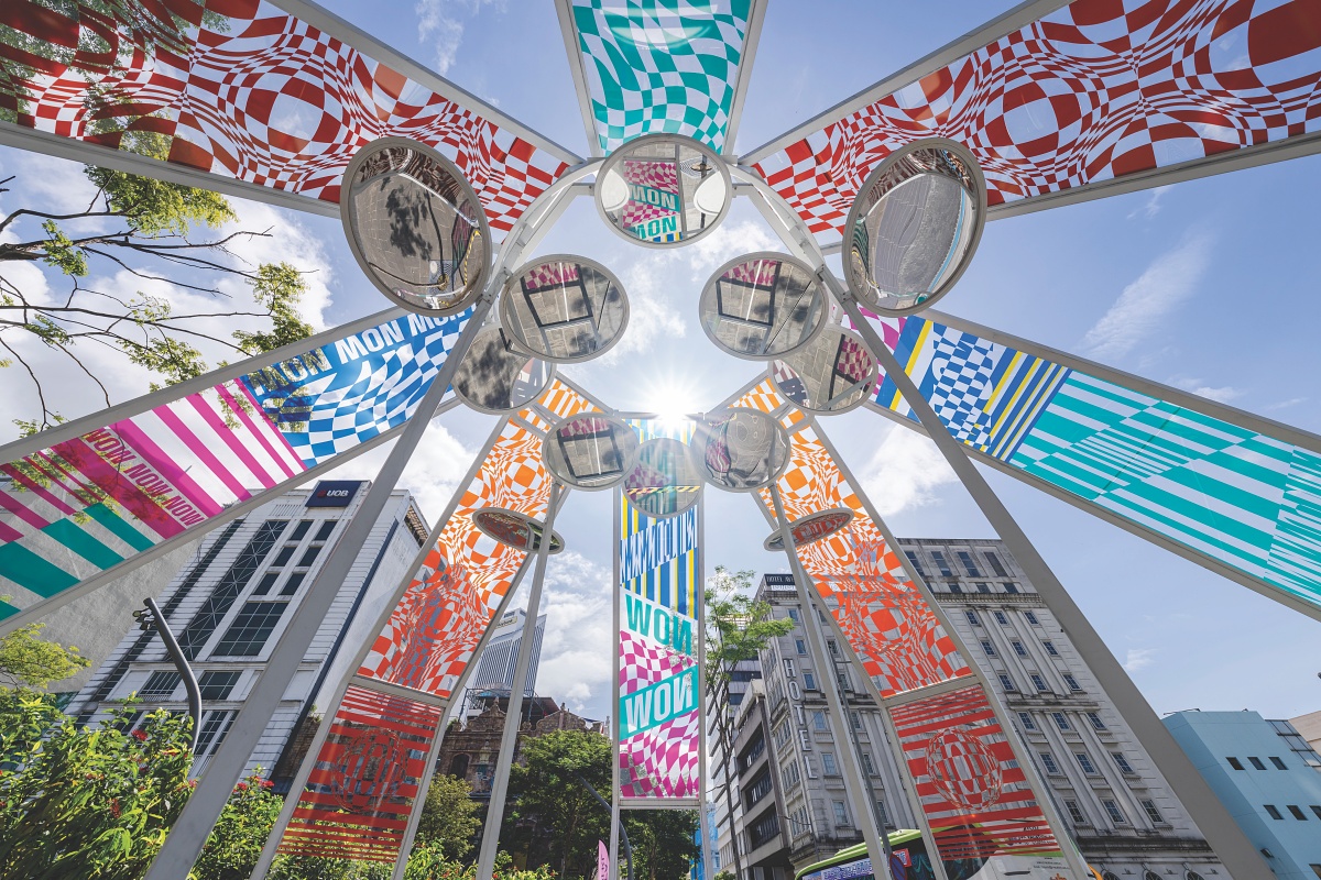 In her 2024 Dreamweaver and Oculus, she fabricated bright steel structures with luminescent panels around the city’s iconic River of Life and Central Market. Both installations explored topics of the subconscious mind, quantum physics, and mental resilience. Oculus, an octagonal open-air pavilion made of white steel flat columns and colourful film, allowed visitors to step inside and look up to a halo of mirrors and the sky. The installation would change in experience, depending on the time of day as the structure casts a shadow. On the other hand, Dreamweaver impacted visitors via clashing prismatic reflections. Its bold colours and simple geometry encouraged visitors to explore it in a ‘dreamlike’ state.