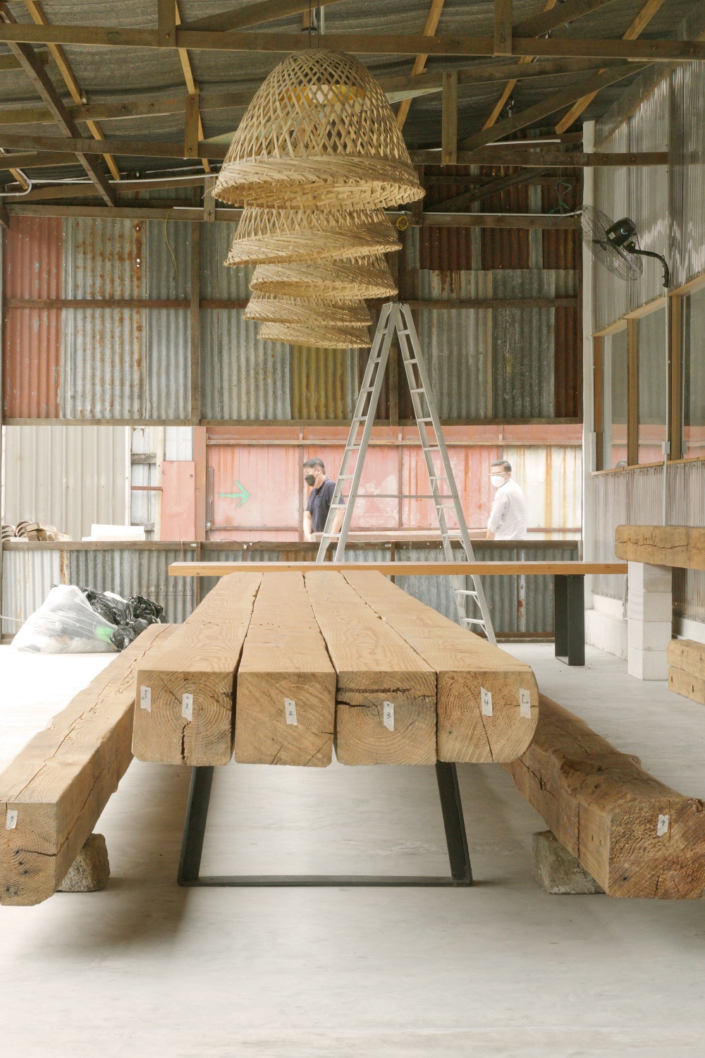 COEX revitalises discarded materials through well-designed and customised solutions. The transformation process included o#-site work where reclaimed timber was repurposed into modular pieces, streamlining the logistics for assembly on site. The timber was altered into working desks, meeting spaces and a stair-like structure, doubling up as an informal meeting space for the practice and a platform for COEX. By retaining the original metal corrugated panels and integrating sustainable elements, COEX preserves the site’s industrial character while providing a contemporary, functional space. The addition of steel framework supports a lightweight yet durable roofing system, ensuring natural ventilation and shading. Newly planted trees along the perimeter soften the industrial aesthetic, contributing to urban cooling and environmental sustainability.