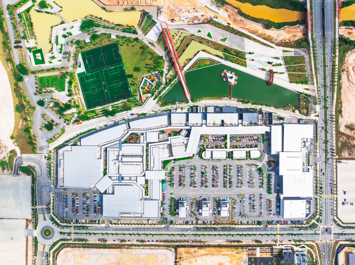 A 40-metre signage tower serves as the prominent landmark, and the serene environment is engaging between the lake and the mall