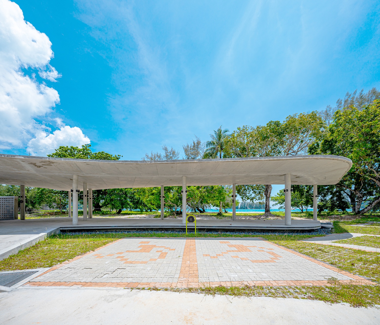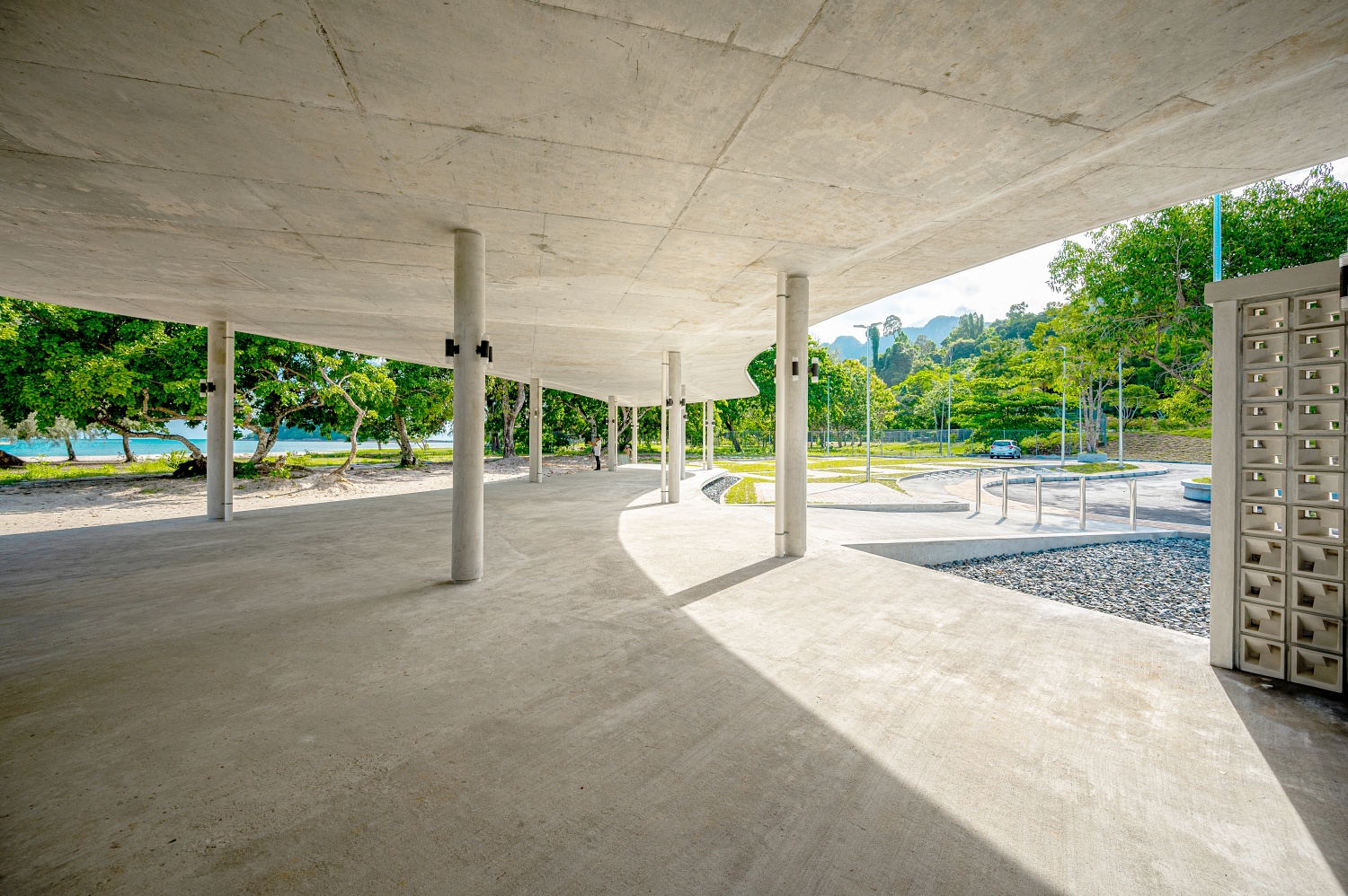 The pavilion’s walls, composed of vent blocks, further enhance this sense of lightness. These permeable surfaces filter natural light and ocean breezes, casting ever-changing patterns of shadow that animate the space throughout the day. The exposed concrete, raw yet refined, interacts with sunlight and the elements, deepening its connection to the natural surroundings.