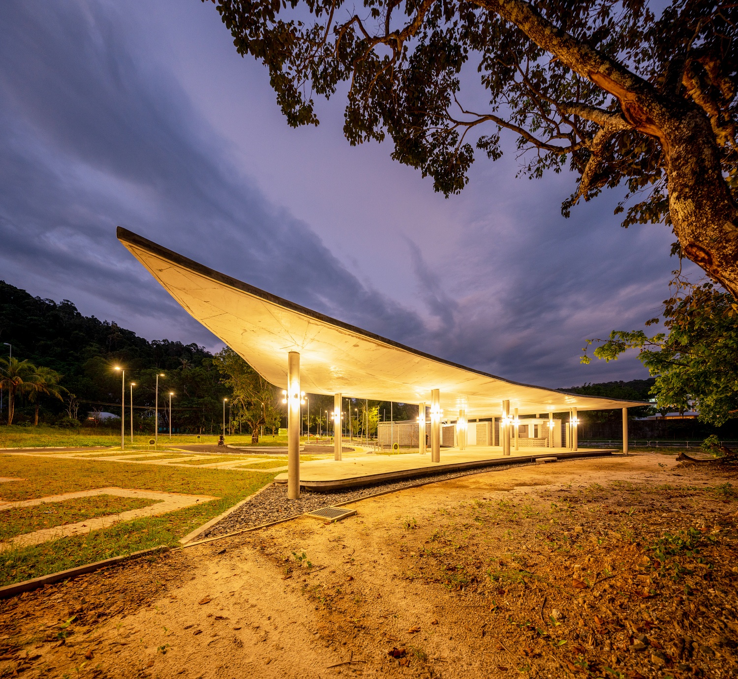 Hentian Cambrian’s pavilion in Langkawi stands as an architectural landmark, its sweeping, wing-like roof embodying the island’s majestic eagles. Crafted from cast-in-place concrete, the cantilevered roof extends outward with striking fluidity, appearing almost weightless as it hovers above slender supporting columns. This structural and sculptural feat reinforces the themes of flight and openness, seamlessly blending with the coastal landscape of Pantai Kok.
