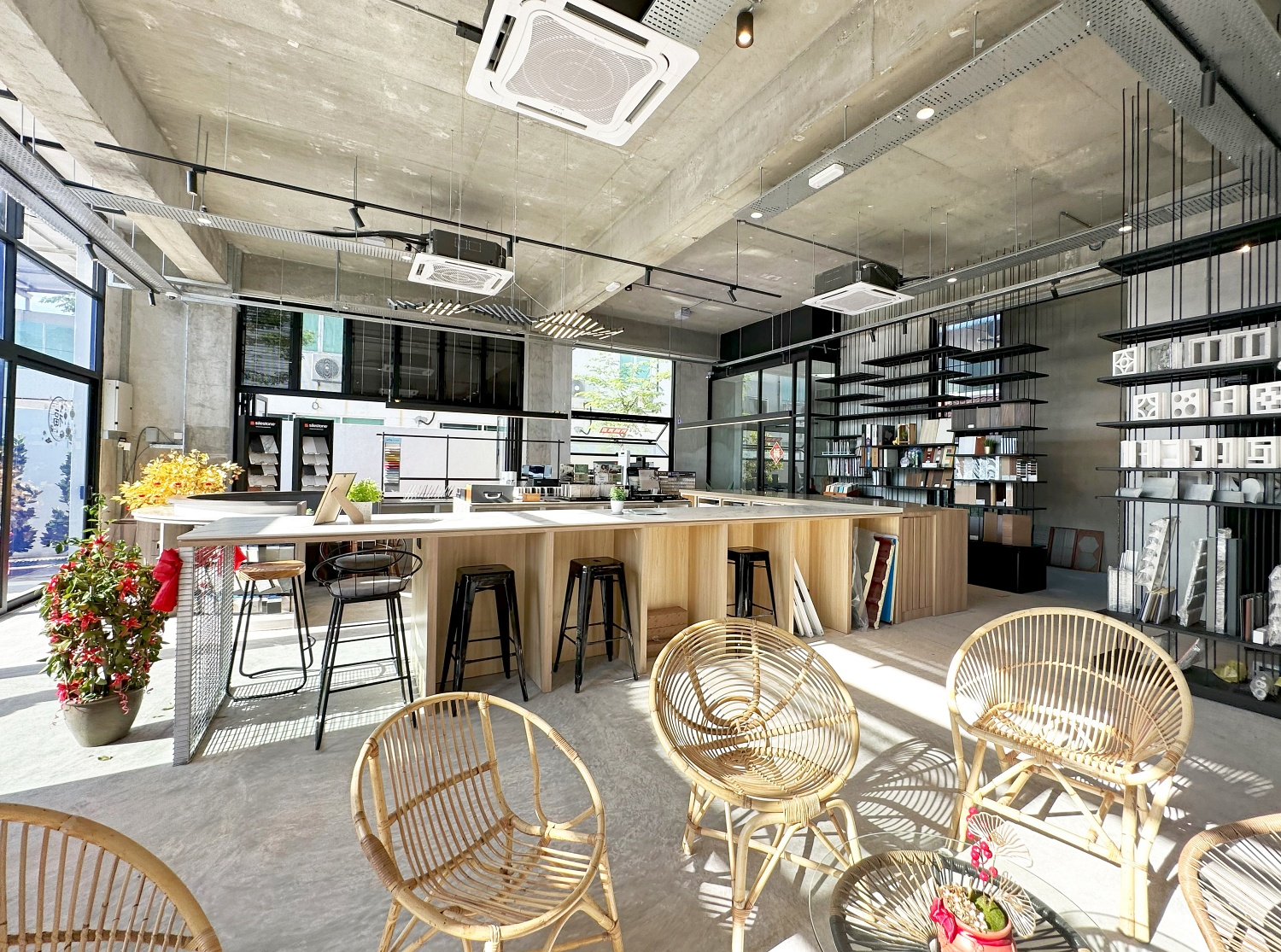 Guided by the skilled hands of architects, an unprecedented curated library made of construction materials is integrated into the space. Furthermore, this unique venue transcends the ordinary, adding a touch of simple charm through a modern LED display to the suburban scenery.