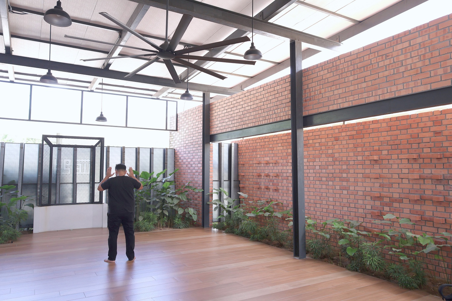 Using exposed clay brick and raw concrete/cement plaster/steel structure and component for all new walls/structure without plaster and paint. Expressing the natural colour using a recycled existing building’s GI purlin as a building façade.