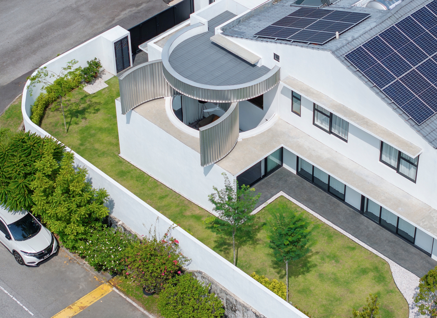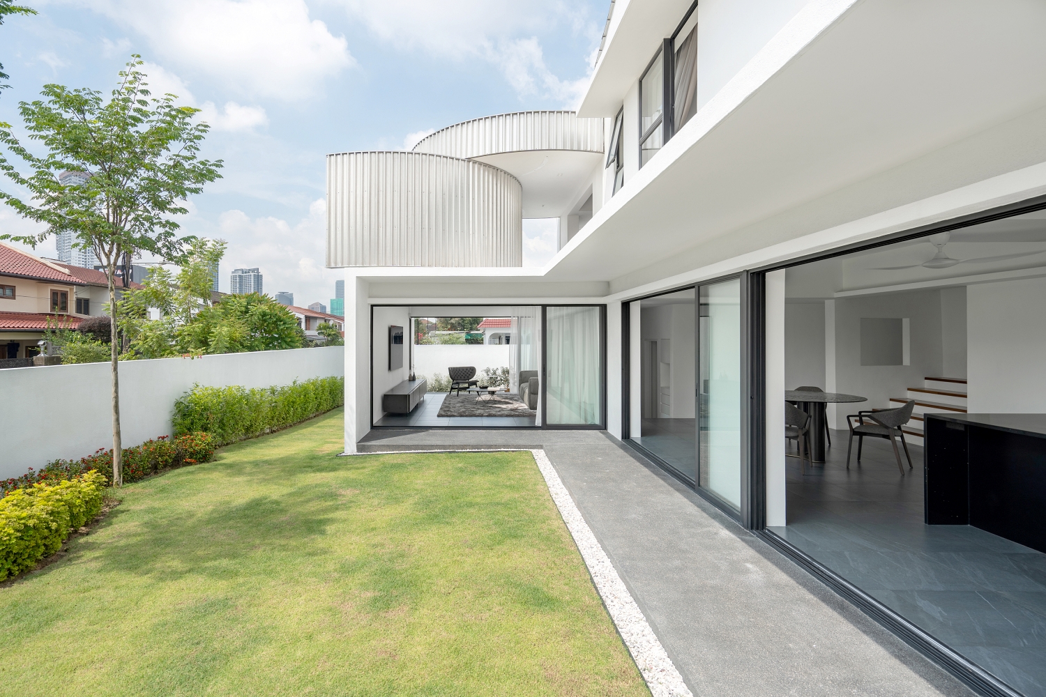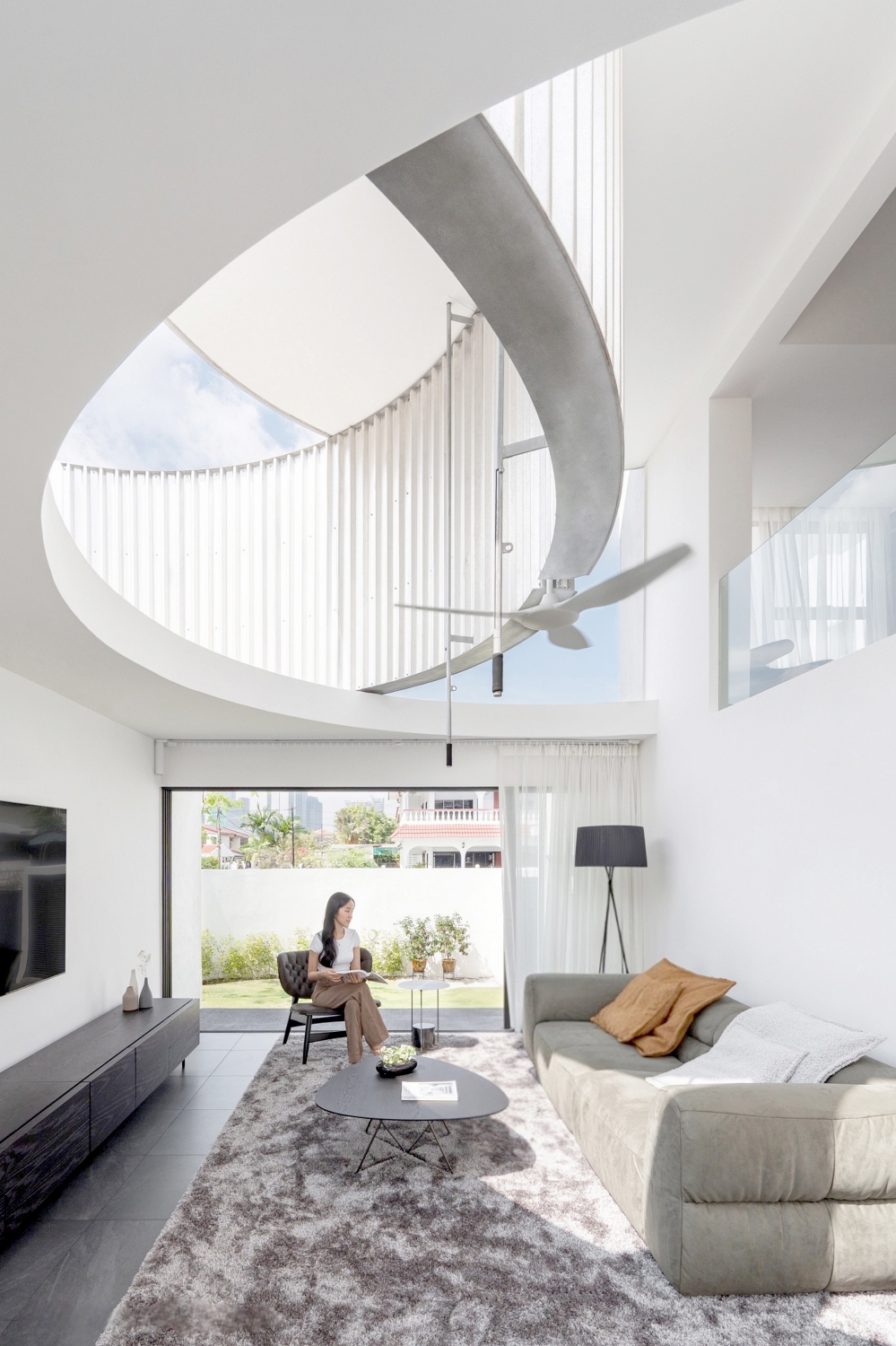 Driving up to the house from the main road, the exterior is unassuming – painted in pristine white, with high garden walls and a curved steel façade rising above the garden wall – hinting that there is more than meets the eye.The brief given by the clients, a young couple, appeared simple with no unusual requirements.