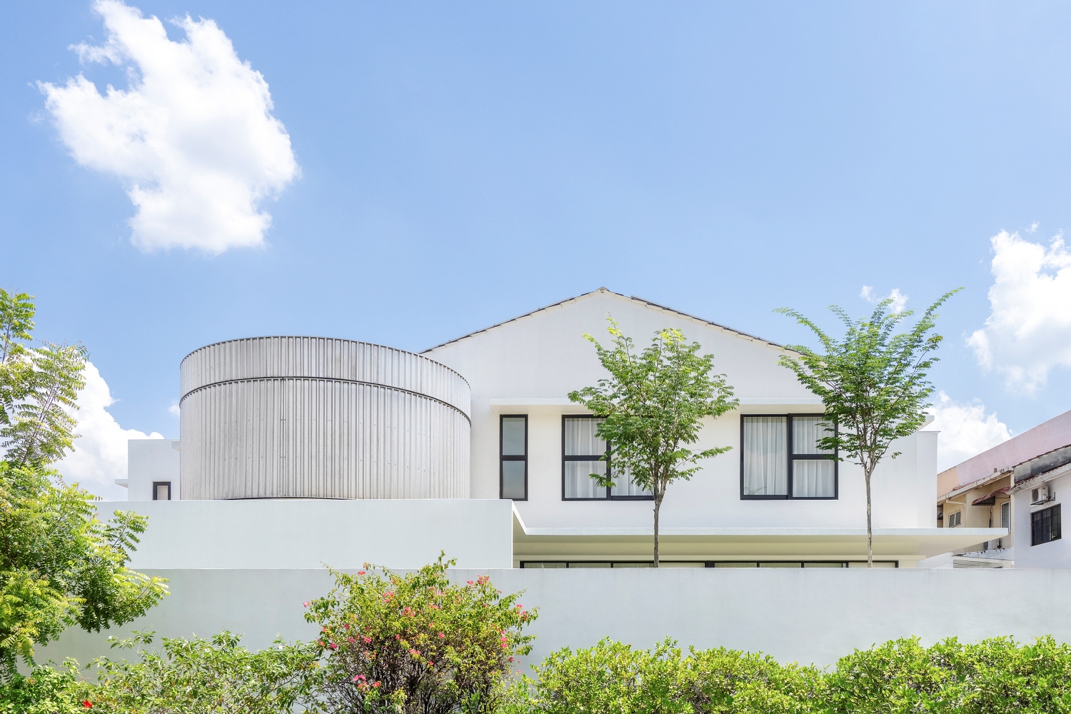 The intentional choice of material for the façade was to allow the shiny galvanised metal to weather into a matte grey, aging with grace akin to old metal telephone poles in Malaysia.Each part of the interior is planned down to the smallest details and precision, such as the ceiling fan set six inches below the moon door, with its structure acting as a stopper to prevent the doors from swinging beyond their arc.