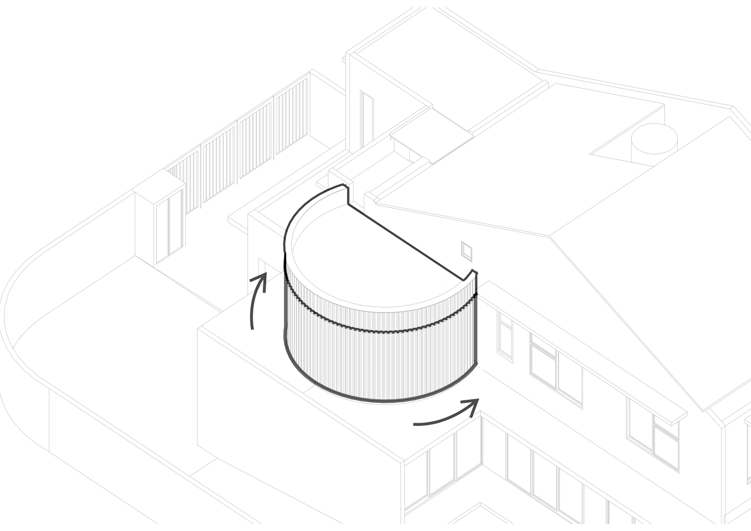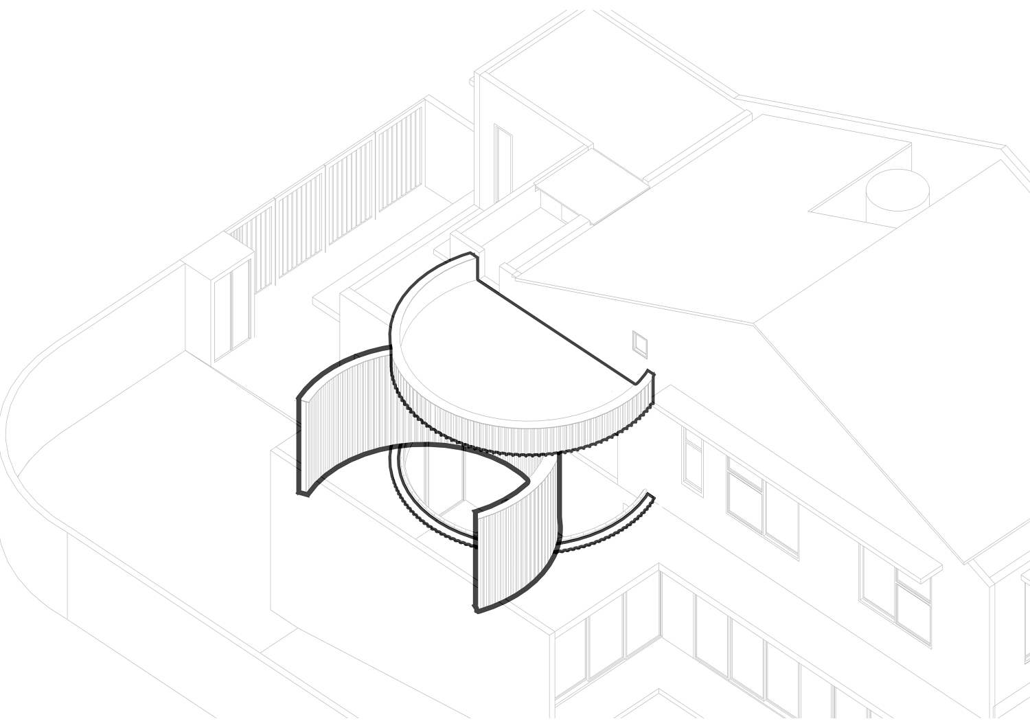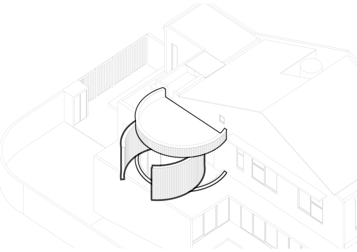 Tucked in the corner of the family room, a spiral staircase leads up to a hatch that opens to a rooftop deck above the semi-circular living room.This outdoor space offers a panoramic view of the neighbourhood and city beyond.