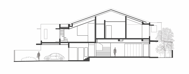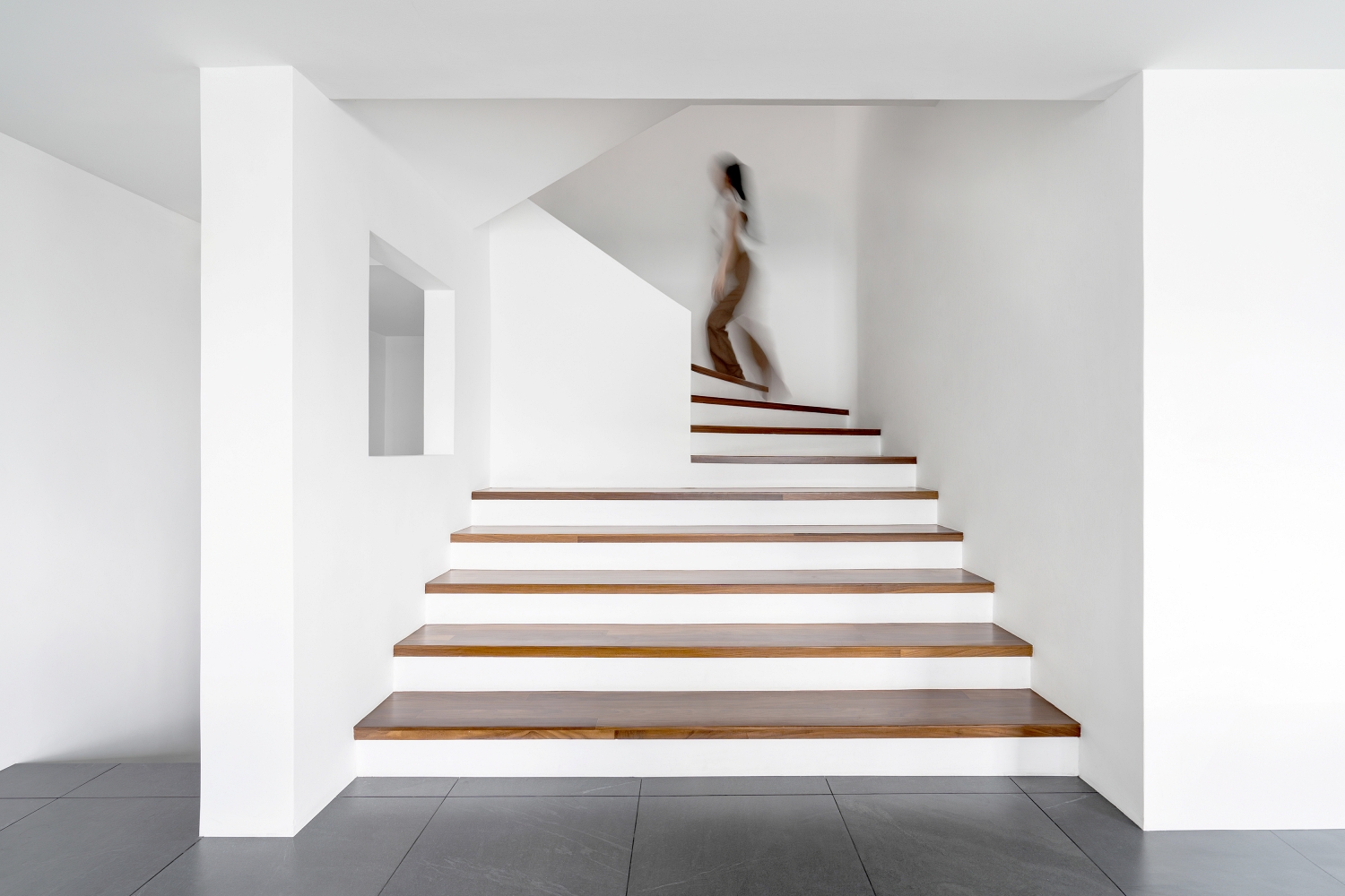 One key instruction was to maintain the existing structure and roof of the house, keeping the split-level, while reconfiguring the interior to suit their needs.These basic conditions were, somehow, coincidentally pushed beyond the clients’ expectations.The entrance doorway opens into a narrow, dark-coloured pebble-wash walkway, where the guest rooms and shared bath are positioned to the left at the entrance level.The walkway visually and instinctively guides one upwards toward the bright, open living spaces, grounded by almost black floors in contrast with the white interior.